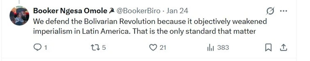 Omole could barely contain his enthusiasm for this blatantly neocolonial policy. The next day, he responded by tweeting, “We defend the Bolivarian Revolution because it objectively weakened imperialism in Latin America.”