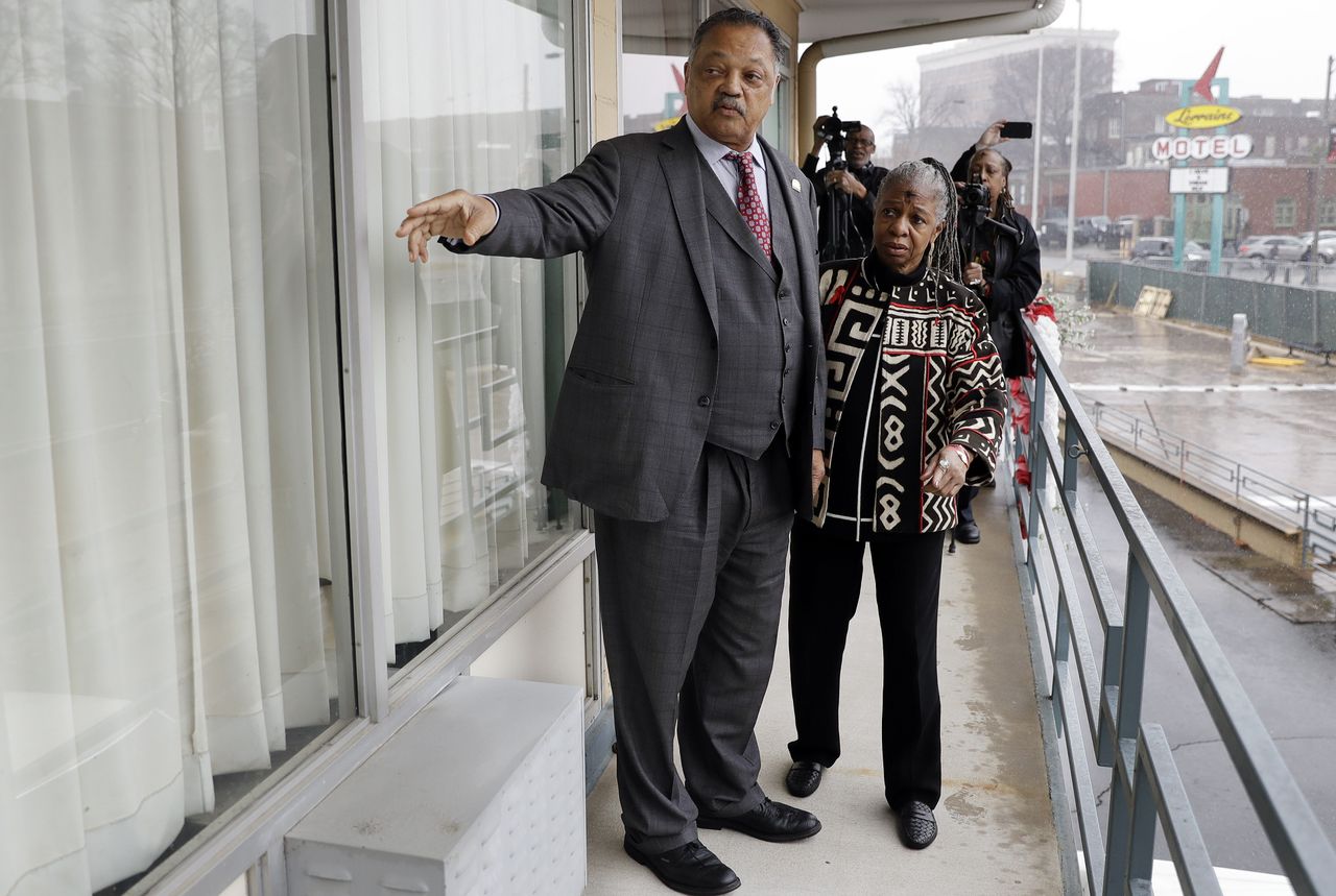 Rev. Jesse Jackson gives Iva E. Carruthers a tour of the balcony at the National Civil Rights Museum Wednesday, Feb. 14, 2018, in Memphis, Tennessee. The Samuel DeWitt Proctor Conference, of which Carruthers is general secretary, is being held at the museum. Martin Luther King Jr. was shot on the balcony of the Lorraine Motel on April 4, 1968. [AP Photo/Mark Humphrey]