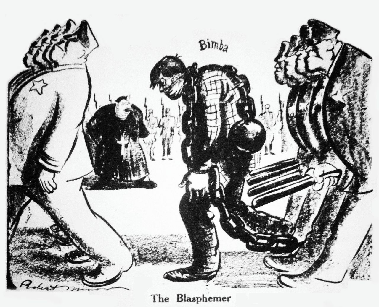 Bimba spoke extemporaneously and although no stenographic report was made of his remarks, he allegedly said, “People have built churches for the last 2,000 years, and we have sweated under Christian rule for 2,000 years. And what have we got? The government is in control of the priests and bishops, clerics and capitalists. They tell us there is a God. Where is he?”