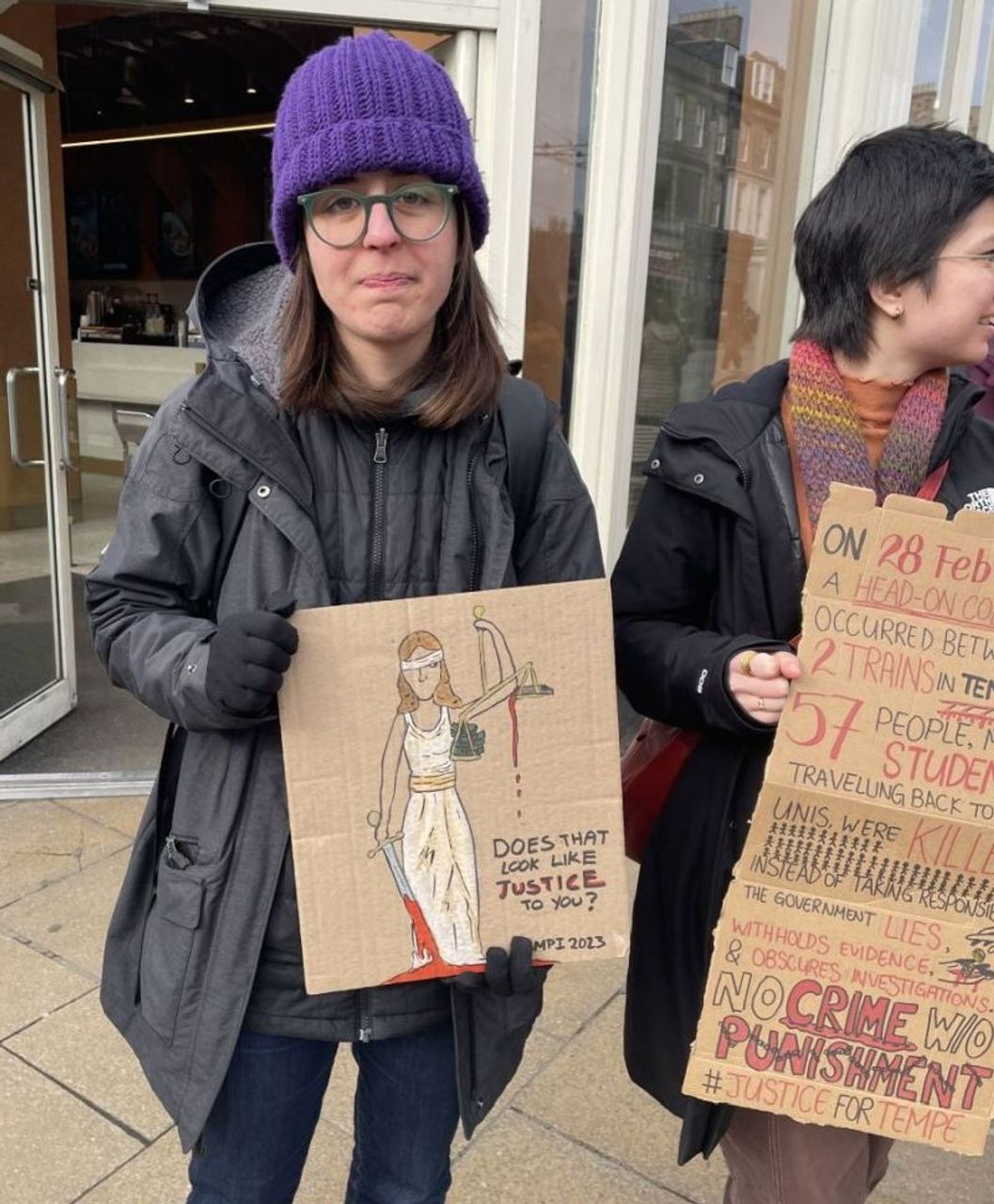 Around 25 people protested in Princes Street in the centre of Edinburgh. Some brought homemade placards, including one naming all 57 victims. Elpida made a homemade placard that had the figure of Justice with a pair of scales tilted in favour of a stack of cash with a blood drenched train carriage on the other side. The phrase underneath read, “Does that look like justice to you?”