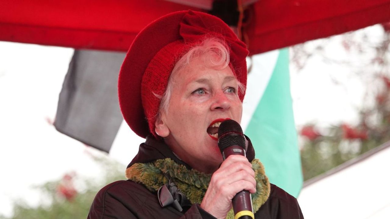 Lindsay German speaking at the rally in London, March 7, 2026