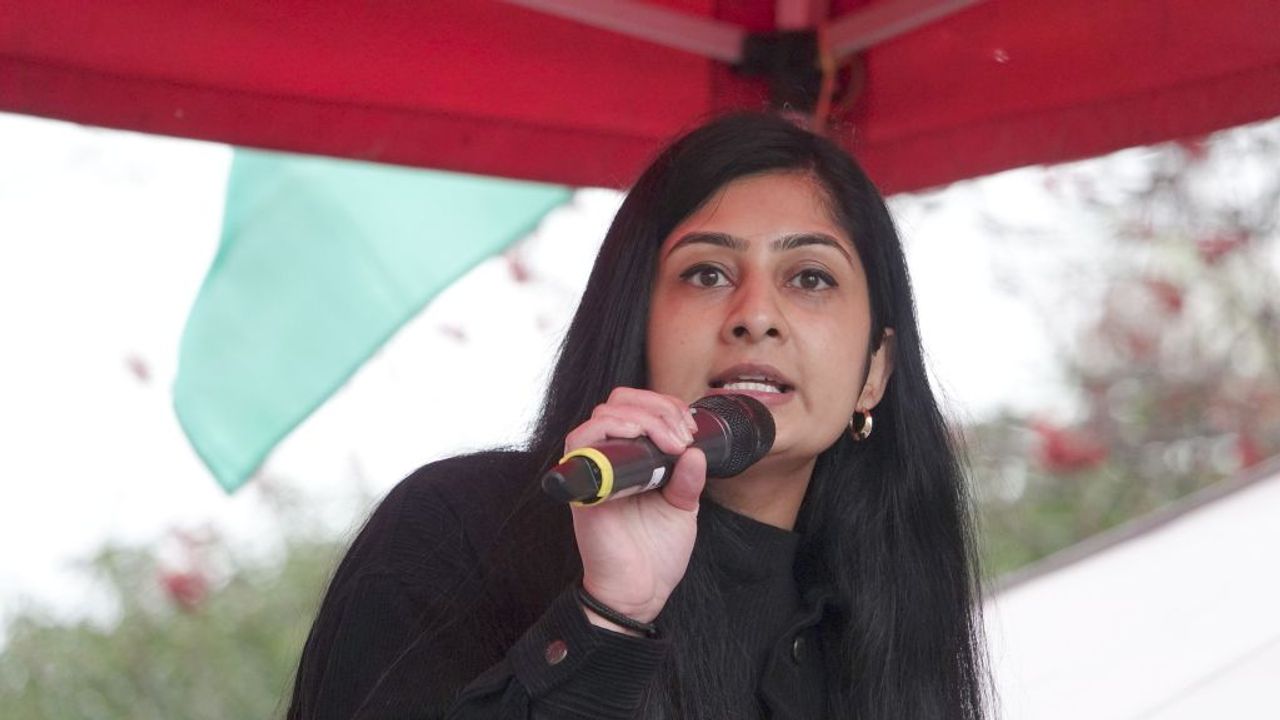 Zarah Sultana speaking at the London rally, March 7, 2026
