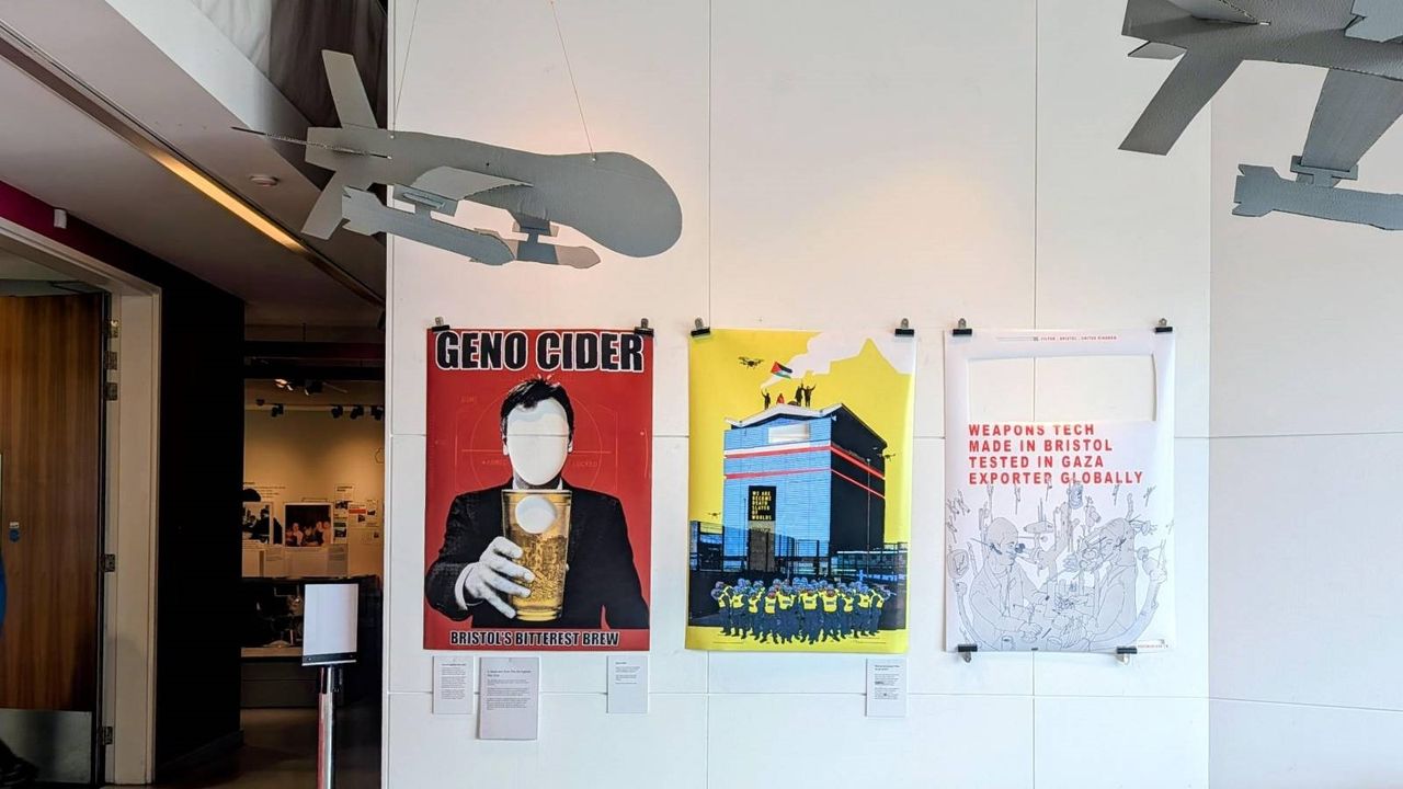 References to Israeli weapons manufacturer Elbit Systems (which operates a factory in nearby Filton) and British-owned BAE Systems, embedded in Science, Technology, Engineering and Mathematics (STEM) programs in local schools, were cut from the artwork, leaving gaping holes.
