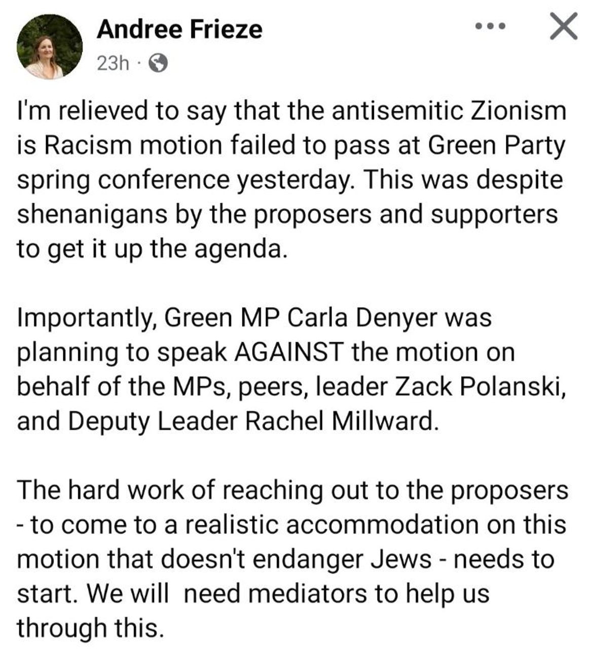 Frieze wrote, cheering the defeat of the Zionism motion, “Green MP Carla Denyer was planning to speak AGAINST the motion on behalf of the MPs, peers, leader Zack Polanski and Deputy Leader Rachel Millward.”