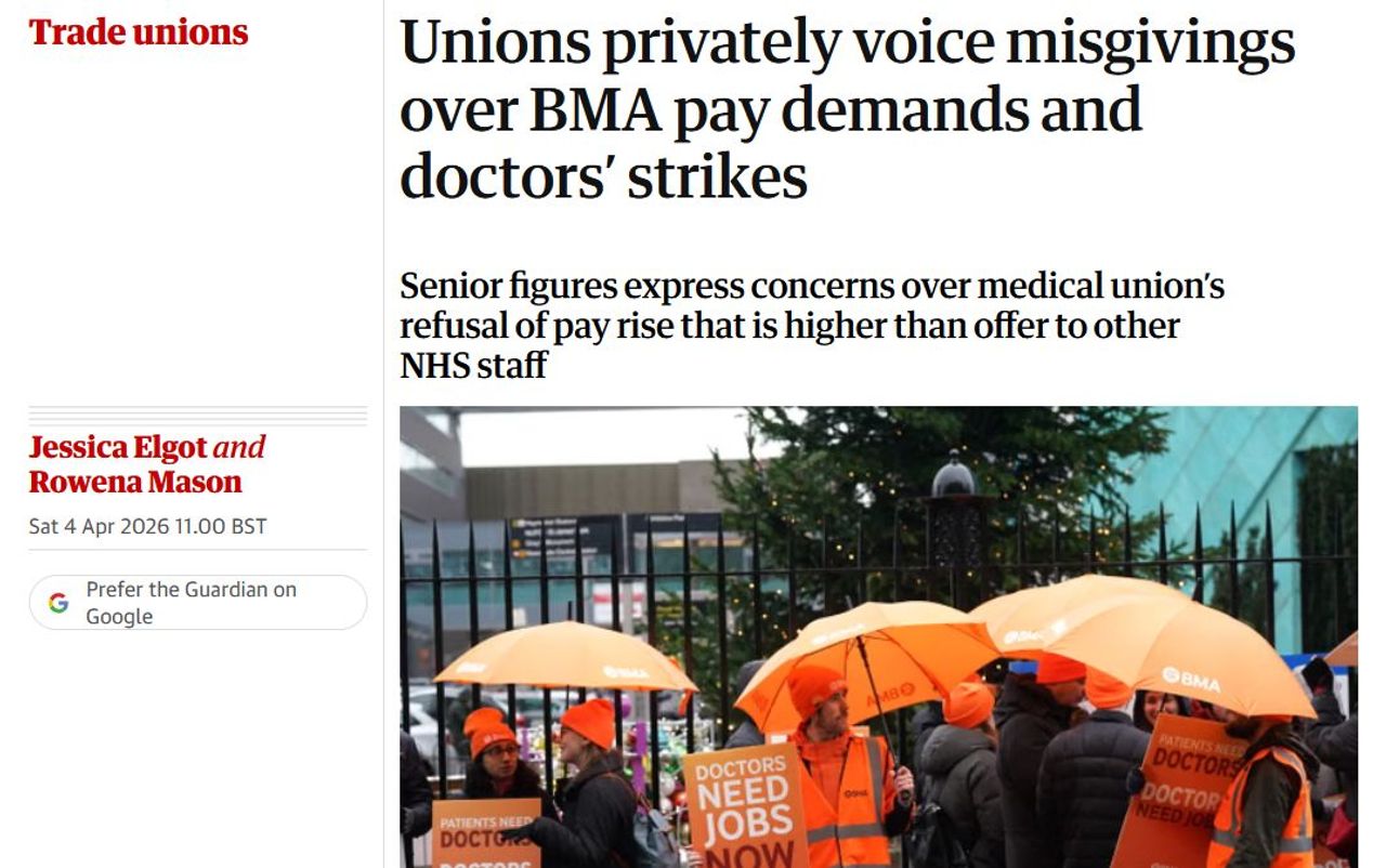 The April 4 article, “Unions privately voice misgivings over BMA pay demands and doctors strikes,” is a public denunciation of resident doctors made on the eve of the strike that began April 7. The only thing “private” about it is the anonymity of the union officials cited, so they are not held accountable by their members while the Guardian presents them as the “voice” of NHS workers.