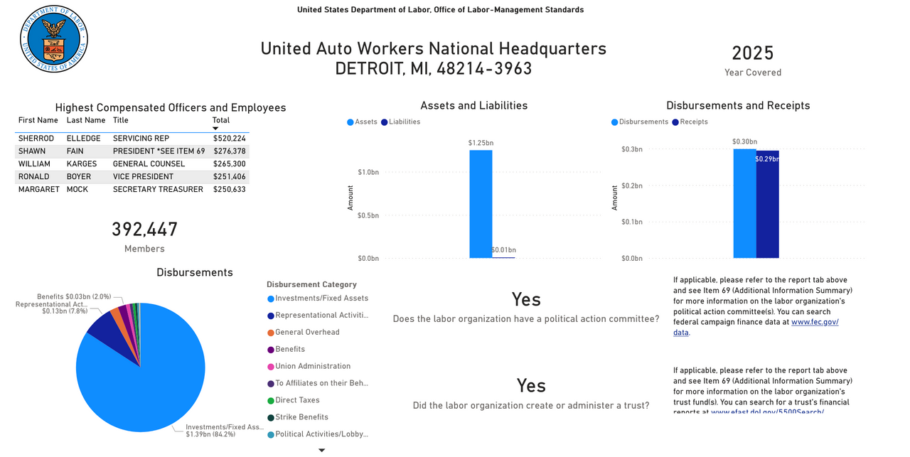 United Auto Workers financial report shows 2025 another bumper year for union apparatus as assets rise to $1.25 billion