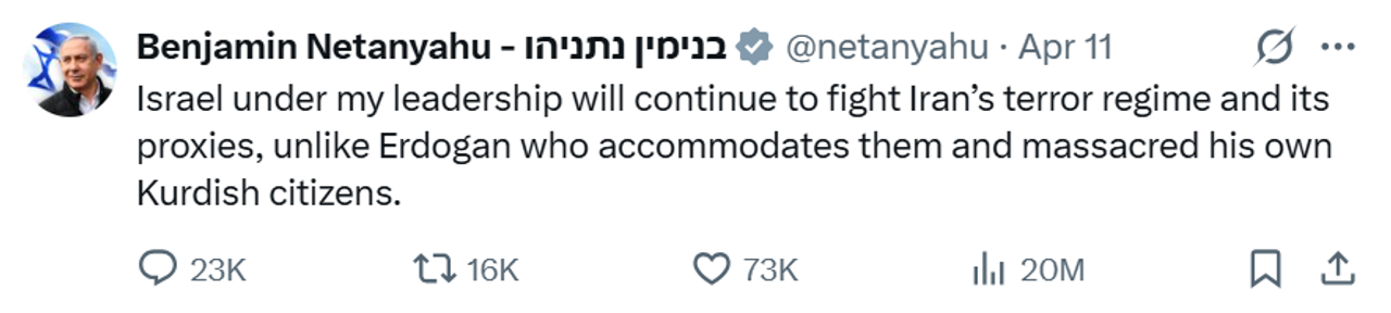 On April 11, Israeli Prime Minister Benjamin Netanyahu accused Turkish President Recep Tayyip Erdogan on X of “massacring his own Kurdish citizens”, “accommodating Iran’s terror regime and its proxies” and undermining regional stability.