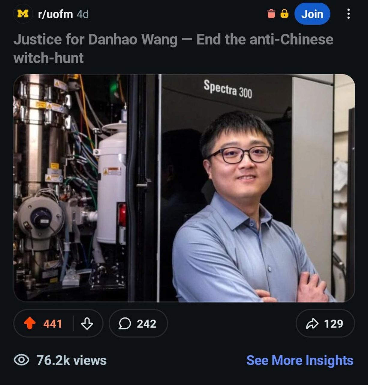 We must begin today by speaking of the death of Danhao Wang. Dr. Wang took his own life, falling from an upper story of the G.G. Brown Laboratory building on North Campus. According to statements released by the Chinese Consulate in Chicago, Wang had been subjected to hostile questioning by federal agents the day before his death. Within days, the Chinese Ministry of Foreign Affairs condemned the encounter as unprovoked investigation and harassment, denouncing the US government for terrorizing lawful international residents in the name of national security.