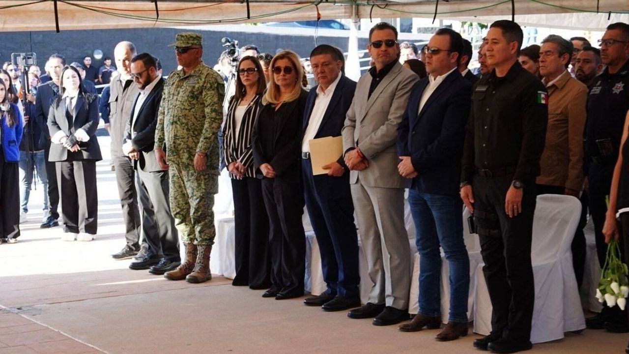 Ceremony for Chihuahua Intelligence Chief Pedro Roman Oseguera Cervantes, who died along with the CIA agents. Chihuahua Governor Maru Campos in the middle [Photo: Fiscalía General del Estado de Chihuahua]