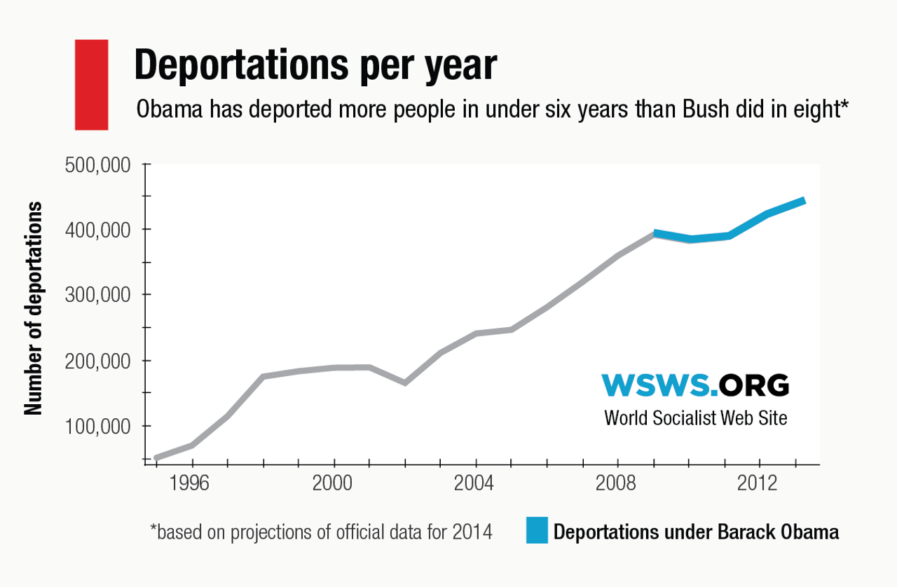 La Casa Blanca de Obama ha deportado a más personas que bajo cualquier otro presidencia. Incluyendo las proyecciones para el 2014, Obama en sus seis años ha deportado más personas que Bush en todo su mandato de ocho años, y más del doble que bajo Clinton.