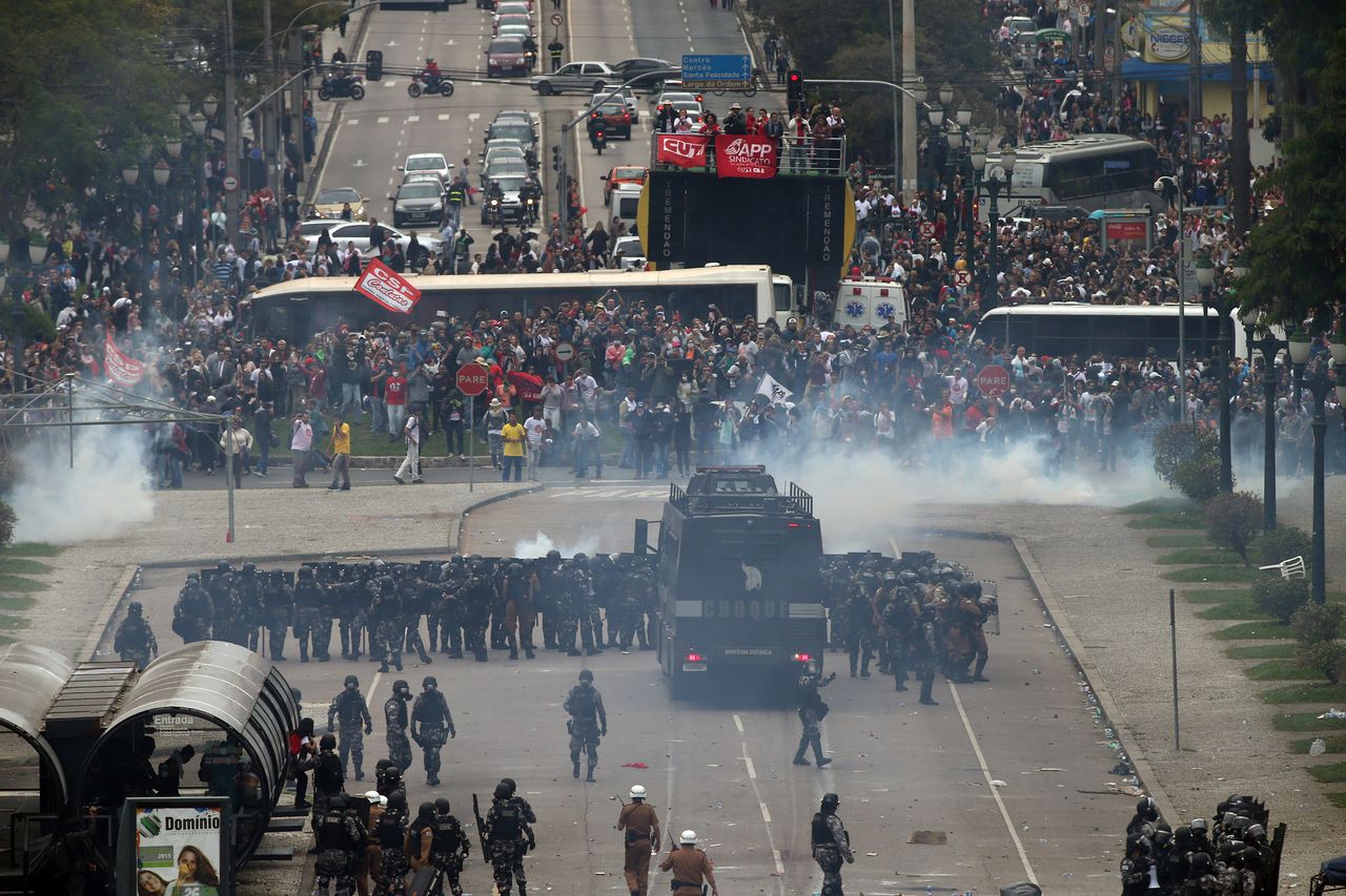 El centro gubernamental de Curitiba fue descrito por muchos como una zona de guerra ese miércoles: mientras miembros con cascos de la Policía Militar y su batallón especial de operaciones BOPE (Batalhão de Operações Policiais Especiais)disparaban en la calle, desde arriba helicópteros dejaban caer gas sobre la manifestación de entre quince y veinte mil maestros y sus partidarios. Se utilizó Vehículos blindados. Un cañón de agua, originalmente adquirido para suprimir las manifestaciones del año pasado en contra de la Copa del Mundo, también se usó contra los maestros.