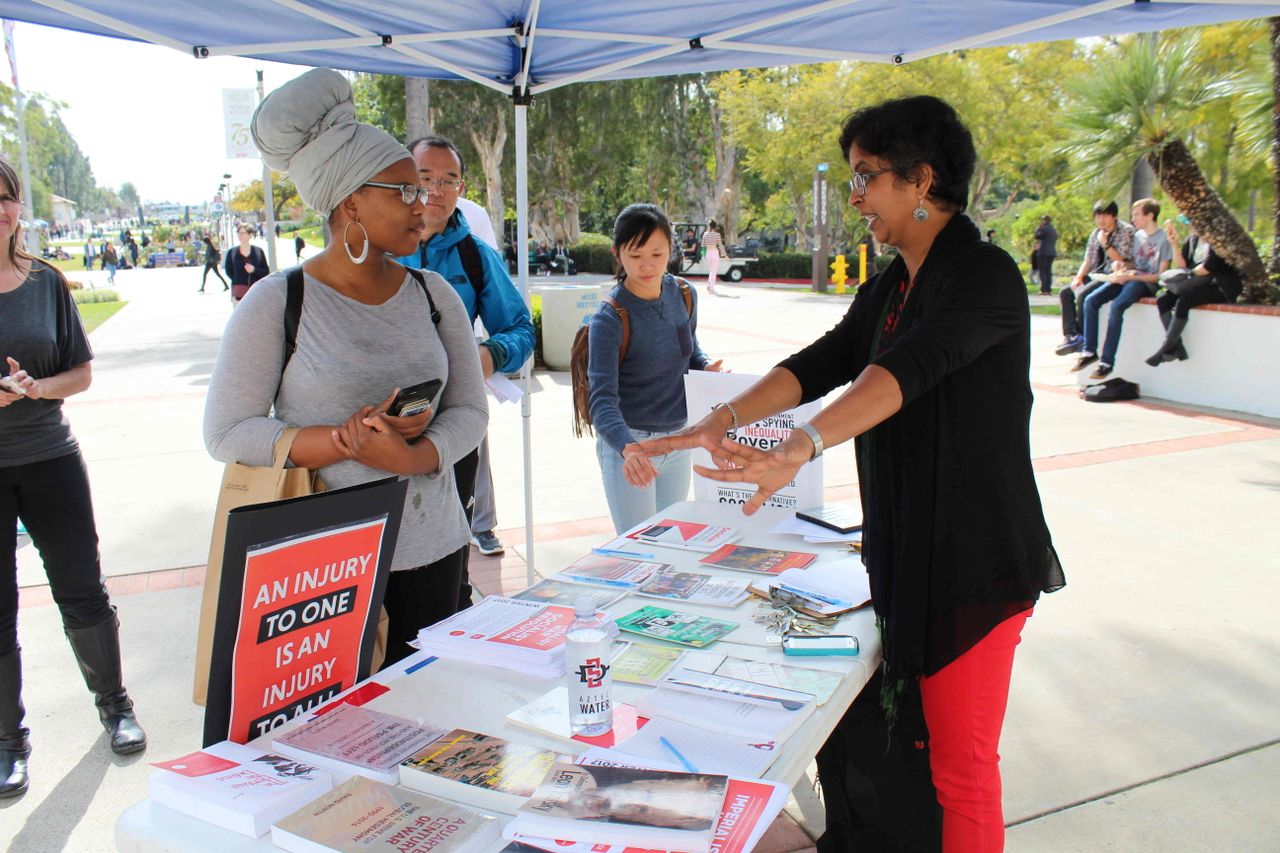 En San Diego, donde muchos estudiantes o son inmigrantes o hijos de inmigrantes, los manifestantes demostraron su apoyo aplaudiendo el llamado a la unidad de los obreros de todas las razas, grupos étnicos y nacionalidades.