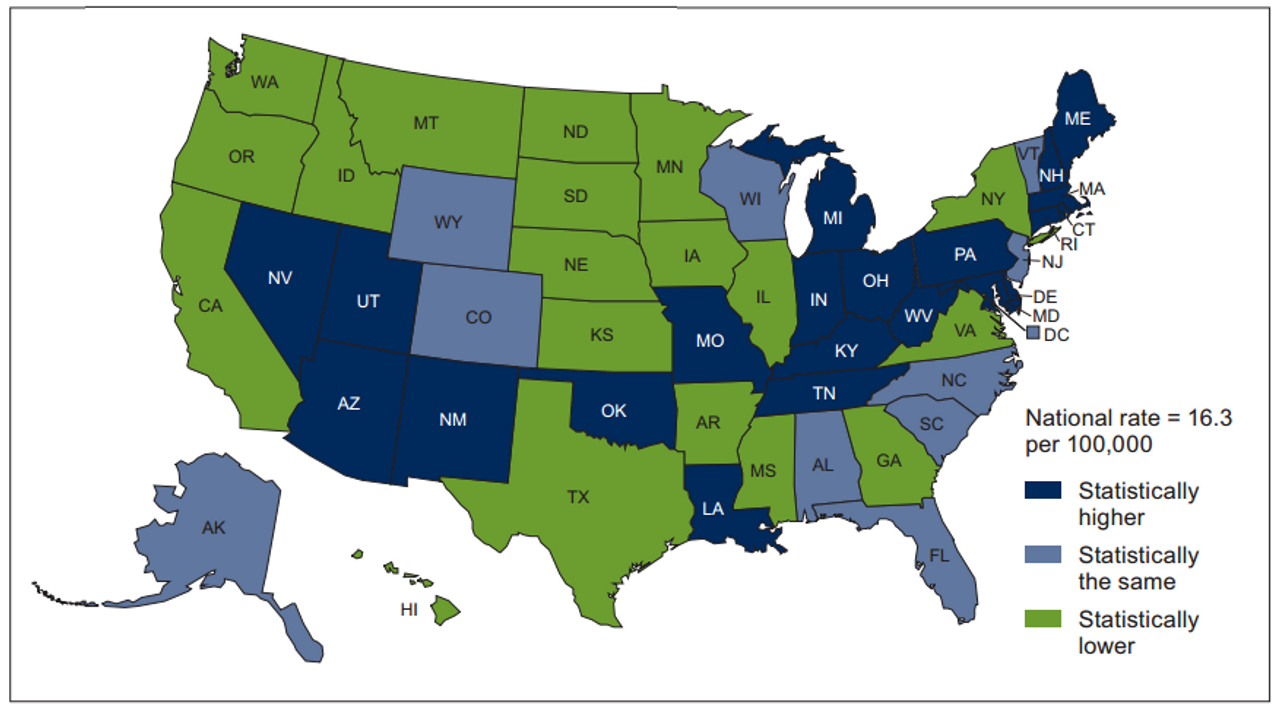 La epidemia de drogas se ha concentrado en lo que fueron regiones mineras de carbón, tales como Kentucky, West Virginia y Tennessee, junto con los estados de Michigan, Ohio, Indiana y Pensilvania del cinturón industrial. Estas regiones han sido las más afectadas del país por las décadas de desindustrialización, despidos masivos y recortes salariales desde los años setenta hasta el día de hoy.