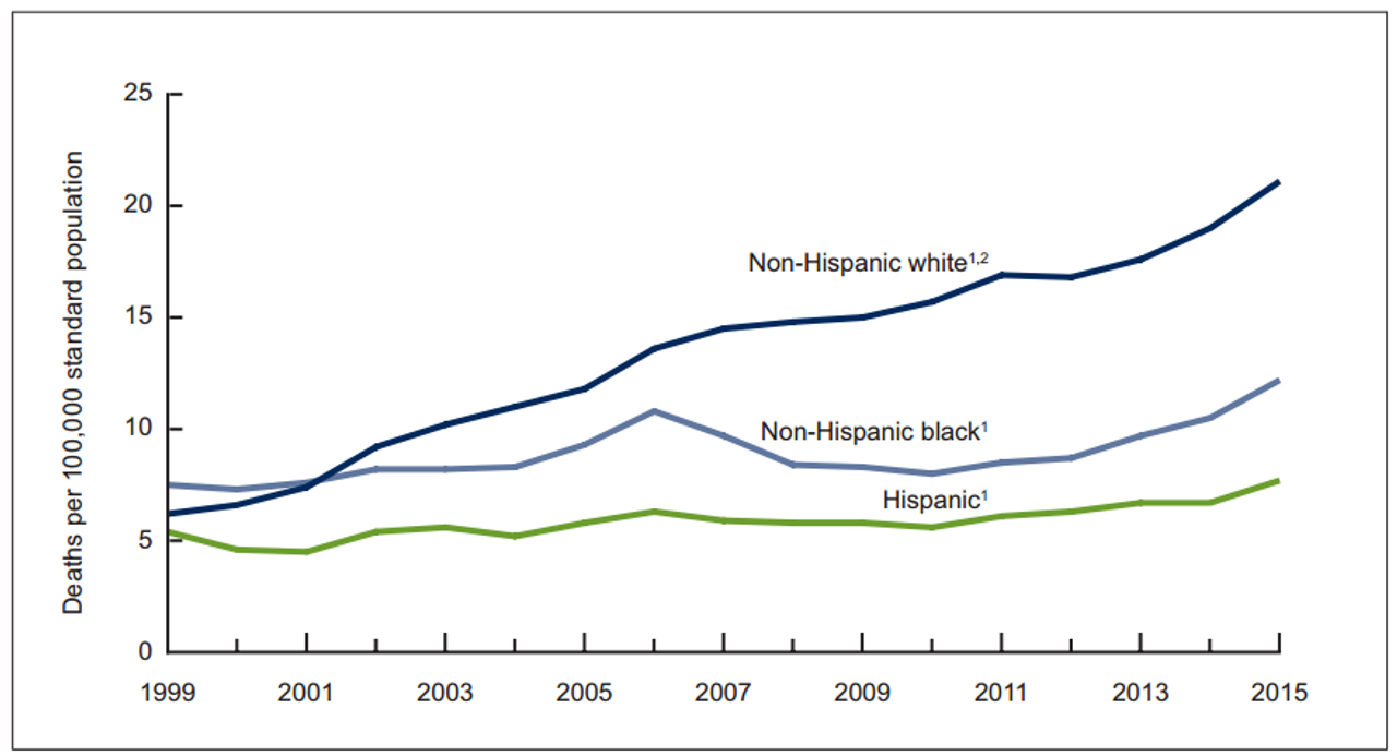 Los estadounidenses blancos tuvieron la mayor tasa de muertes por sobredosis de cualquier etnicidad, más que el doble que la tasa combinada entre los negros y latinos. La mortalidad para blancos, que era menor que la de los negros en 1999, se ha triplicado desde entonces.
