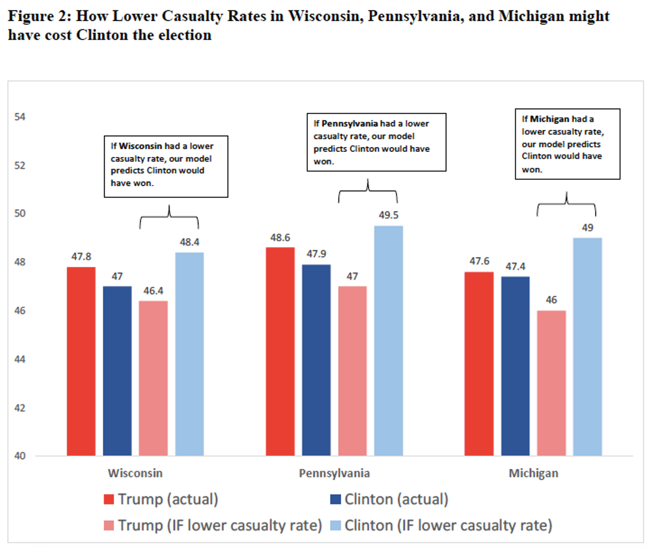 Los autores concluyen qué si las tasas de víctimas en Pensilvania, Michigan y Wisconsin se redujeran en 10 personas por millón, Clinton habría ganado en los tres estados. Trump ganó cada estado por menos del 1 por ciento, empujándolo más allá de los 270 votos electorales necesarios para ganar las elecciones.