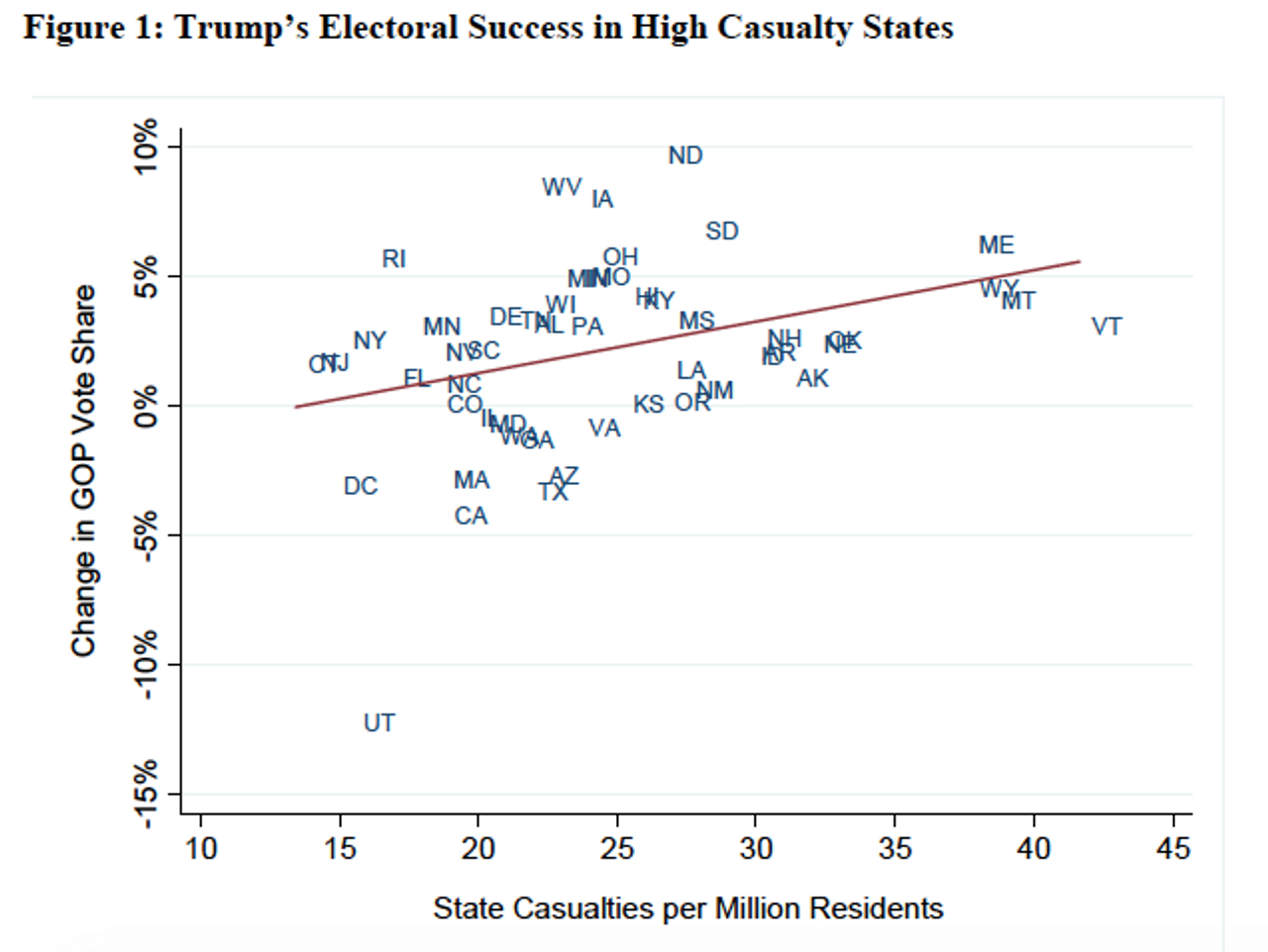 “Nuestro análisis predice que Trump habría perdido entre 1,4 y 1,6 por ciento de los votos si el estado hubiera sufrido una menor tasa de bajas. Como se ilustra en la Figura 2, dichos márgenes habrían trasladado fácilmente los tres estados a la columna Democráta. La capacidad de Trump de conectarse con los votantes en las comunidades agotadas por más de quince años de guerra pudo haber sido críticamente importante para su estrecha victoria electoral”.