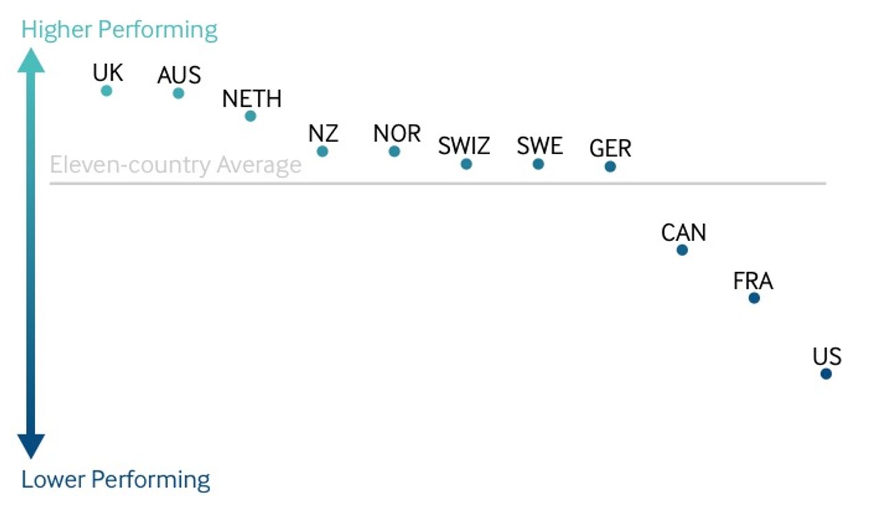 El reporte compara el rendimiento del sistema de cuidado a la salud en EE.UU. con aquél en los 10 otros países de mayor ingreso, haciendo un ránking de cinco áreas: proceso del cuidado, acceso, eficiencia administrativa, equidad y resultados de sistema a la salud. EE.UU. yace mayormente al final excepto en un área estudiada: proceso del cuidado, en el que sale quinto.