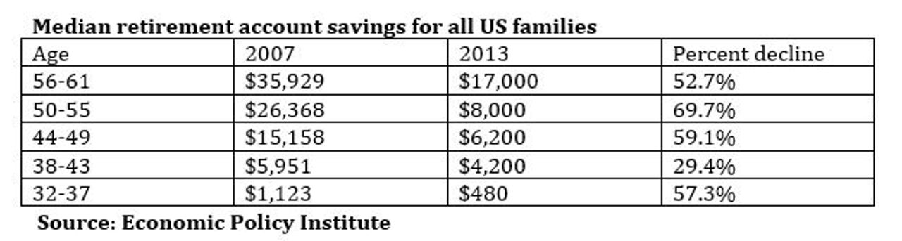 Incluso por encima de los 200 millones de personas que no tienen ahorros, las condiciones para los percentiles 60 a 90 son similarmente difíciles. El grueso del patrimonio neto de esta sección de la clase obrera se encuentra en la forma de sus viviendas, y cuando se resta esto, la mayoría no tienen suficiente ni siquiera para sobrevivir más allá de algunos años en el retiro. Un estudio reciente del Economic Policy Institute, basado en datos del censo, las cuentas de ahorros de jubilación han colapsado durante los últimos años para todos los grupos etarios.