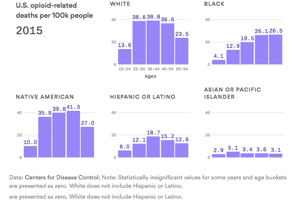 Las víctimas por la crisis de opiáceos residen provienen de todas las regiones y niveles socioeconómicos; sin embargo, la gran mayoría de los fallecidos son pobres y de clase trabajadora. Según datos de los CDC del año pasado, el 90 por ciento de ellos eran blancos, la mayoría eran hombres. Las sobredosis de blancos triplicaban la tasa de los negros y duplicaban la tasa de los latinos. La tasa de sobredosis para los nativos americanos equivale a la de los blancos.