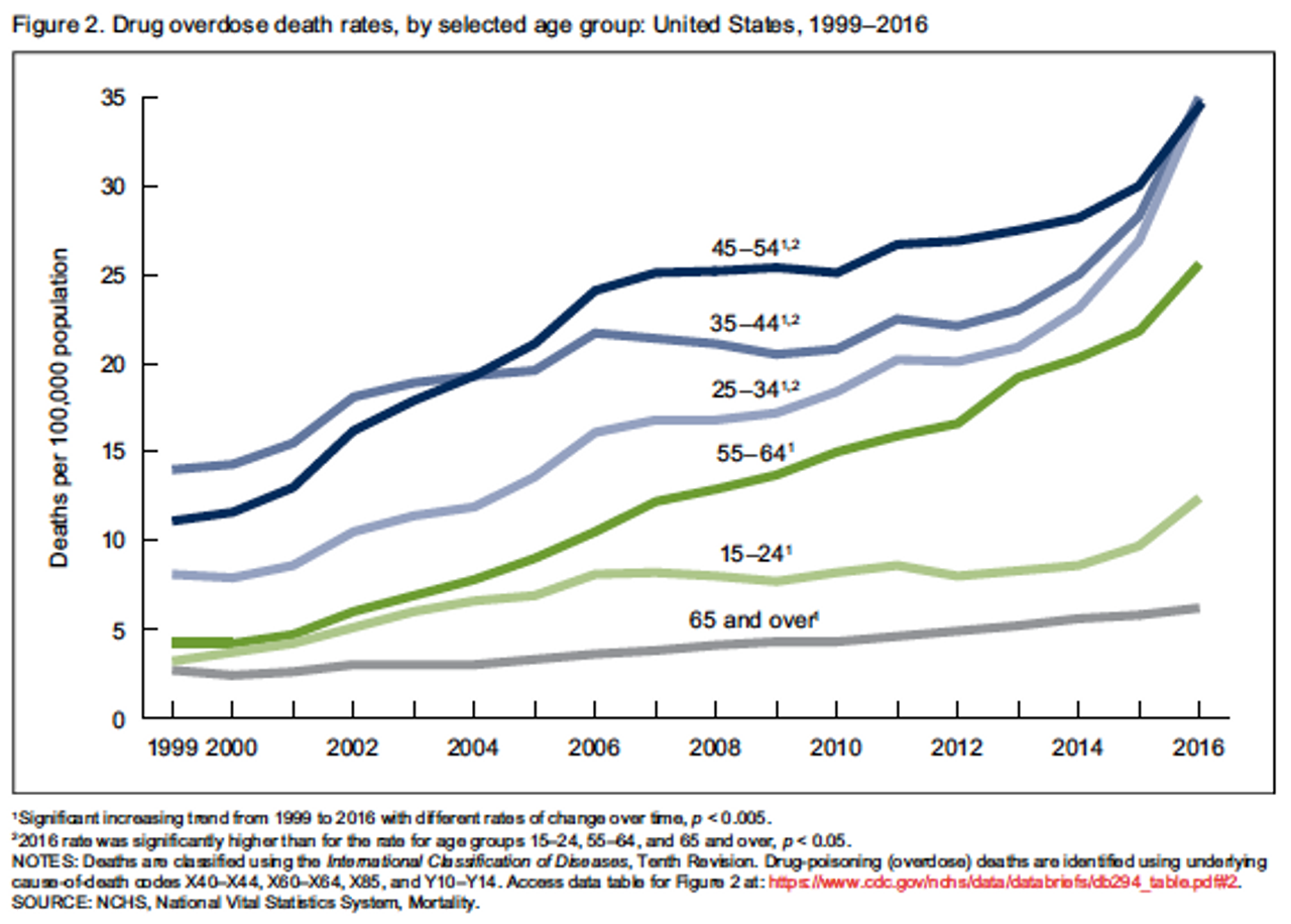 Sin embargo, la expectativa de vida para las personas de mayor edad continúa mejorando, mientras que las tasas de mortalidad para los padecimientos del corazón, cáncer, entre otros siguen reduciéndose a medida que los avances tecnológicos y médicos potencian la capacidad para extender la vida humana. En cambio, el retroceso en la esperanza de vida se debe a un amento dramático en la mortandad de la población menor a 44 años de edad, la cual está muriendo en mayor medida de sobredosis, particularmente de opiáceos, o acabando con sus propias vidas.