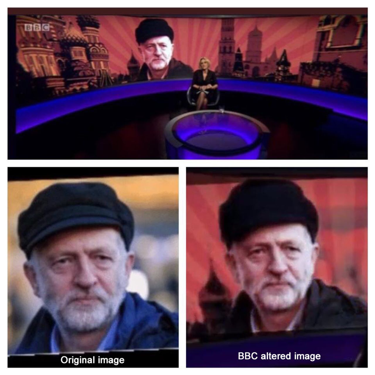 La respuesta de Corbyn en el Guardian, publicada el jueves, desató una ira aún mayor, con el Daily Telegraph llamándolo “no digno de ser primer ministro”. El programa de televisión “Newsnight” de BBC, referente en Reino Unido para asuntos domésticos, “discutió” la cuestión frente a un fondo panorámico mostrando una imagen alterada en Photoshop de Corbyn con un sombrero ruso y frente a un segundo plano del Kremlin retratado en sombras de rojo.