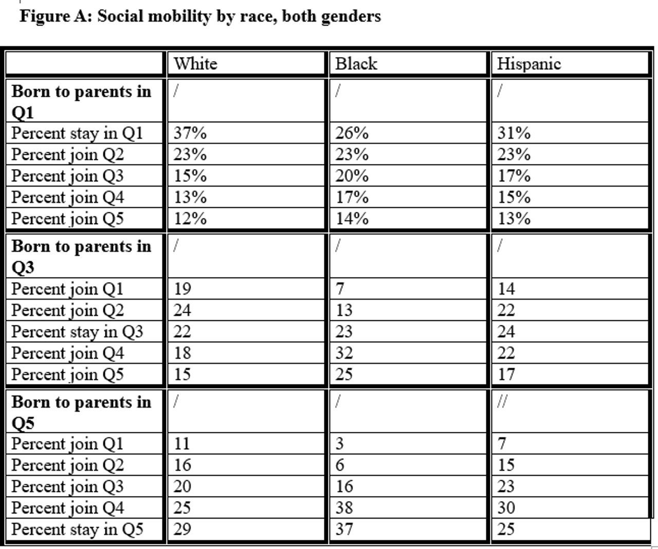 Aquí se ve como las cifras de movilidad social aparecen entre los padres de los quintiles I (los más adinerados), III, y V (los más pobres). El estudio indica que la movilidad varía según raza.