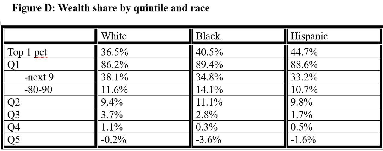 Confirmando las estadísticas de la tabla B, el aumento en el grupo I es engañoso, porque casi todo el cambio ocurrió en el cinco por ciento más alto. Entre afroamericanos el cambio en el cinco por ciento más rico explica el 112,7 por ciento del aumento del grupo 1, para los latinos el 103,2 por ciento. Todo eso demuestra que ha disminuido la tajada de noventa y cinco por ciento de las familias afroamericanas y latinas.