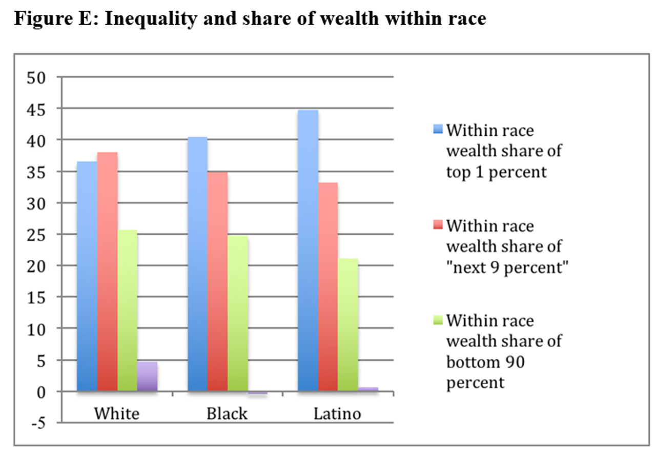 Las dos terceras partes más pobres de afroamericanos (25,2 millones de personas) poseen riquezas negativas; sus deudas exceden su riqueza. Los dos tercios más pobres de latinos y los blancos casi no tienen riquezas. En los tres grupos, la riqueza del uno por ciento más rico es más del doble que la de los cuatro quintiles de abajo.