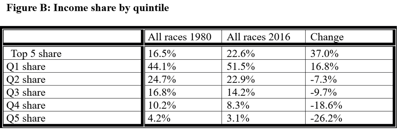 La primera tabla indica la tajada del ingreso familiar total que le toca a cada quintil. También contiene el ingreso total de las familias en el cinco por ciento más rico. Las cifras son para los años 1980 y 2016 y el cambio de tajadas durante estos años relativo a 1980.