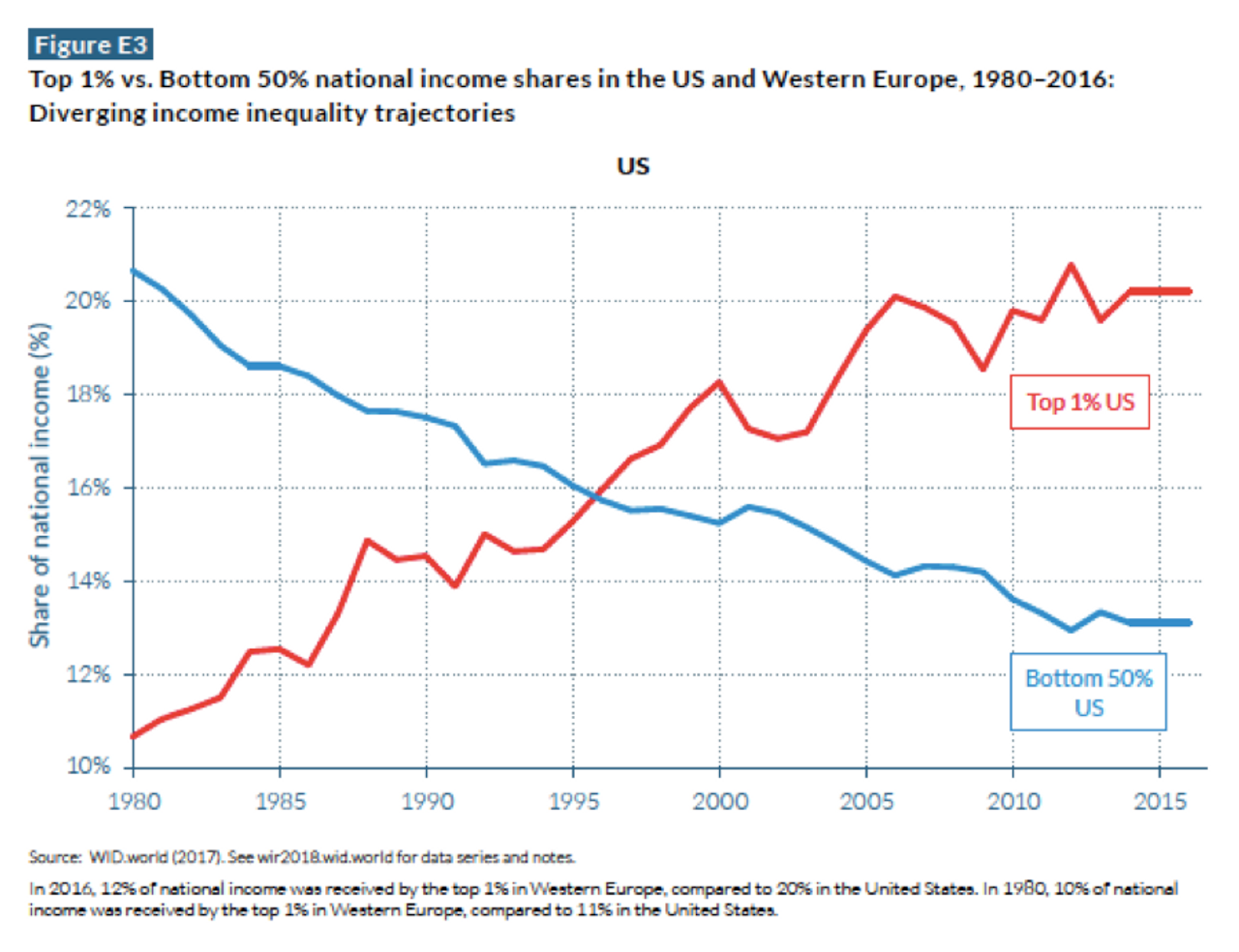 El 1 por ciento superior de Europa aumentó su participación de ingresos del 10 por ciento en 1980 al 12 por ciento en 2016. En los Estados Unidos, sin embargo, el 1 por ciento superior aumentó de la misma cifra -10 por ciento en 1980- al 20 por ciento en la actualidad.