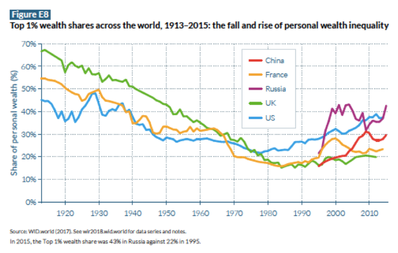 La revolución sacudió al mundo. El informe señala: "En las economías emergentes, las conmociones políticas y sociales llevaron a una reducción aún más radical de la desigualdad de ingresos. La abolición de la propiedad privada en Rusia, la redistribución de la tierra, las inversiones masivas en educación pública y el estricto control gubernamental sobre la economía a través de planes quinquenales extendieron efectivamente los beneficios del crecimiento desde principios de la década de 1920 hasta la década de 1970”. Además, "la población mundial, las primeras tres cuartas partes del siglo XX correspondieron a una compresión muy fuerte en la distribución de los ingresos nacionales".