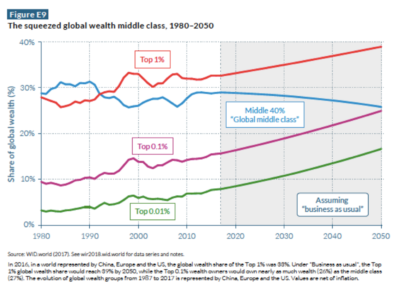 La participación actual de la riqueza total controlada por el 1 por ciento superior es del 33 por ciento, frente al 28 por ciento en 1980, un cambio que refleja la transferencia de billones de la clase trabajadora a los ricos. El 10 por ciento superior del mundo ahora posee más del 70 por ciento de la riqueza total. La mitad inferior de la población mundial, 3.500 millones de personas, posee menos del 2 por ciento de la riqueza.