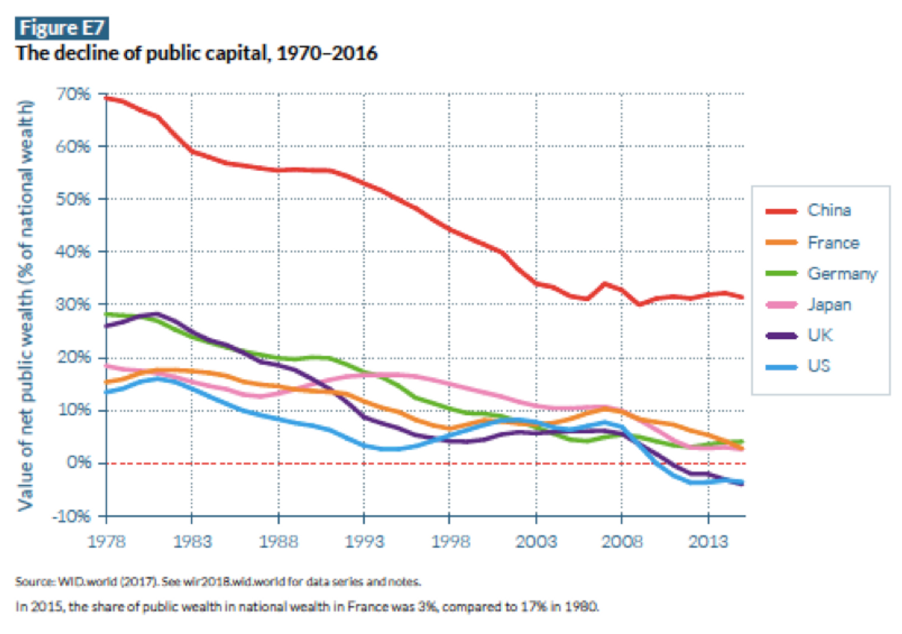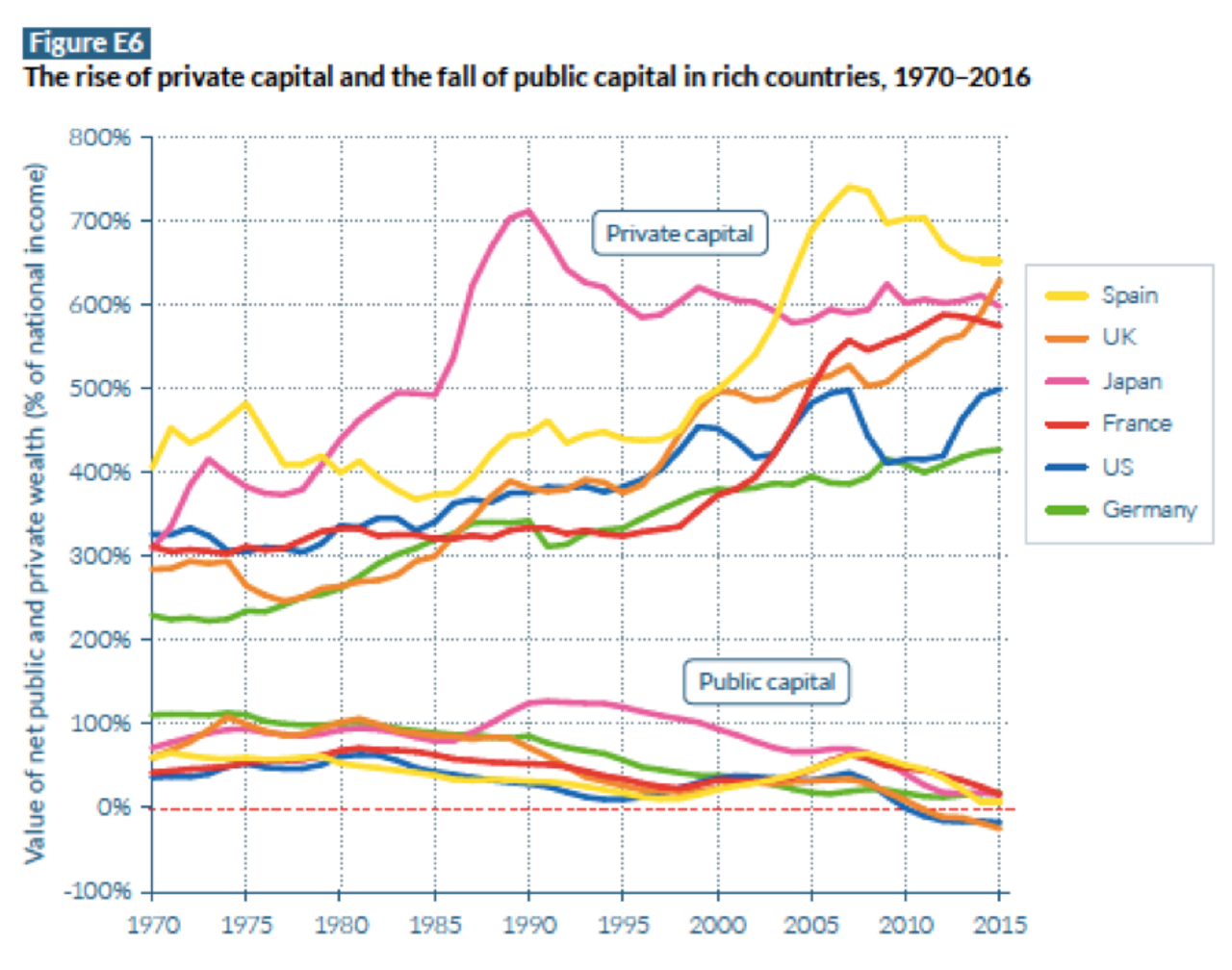 El informe señala: "La dominación de la riqueza privada sobre la riqueza nacional representa un cambio notable de la situación que prevaleció en la década de 1970, cuando la riqueza pública neta era típicamente entre 50% y 100% del ingreso nacional en la mayoría de los países desarrollados (y más del 100% en Alemania)".