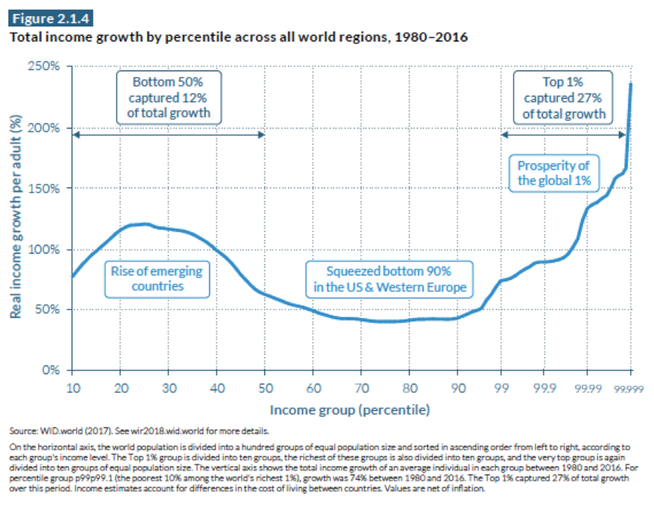 En términos de ingresos, el 1 por ciento superior capturó el 23 por ciento del ingreso mundial de 1980 a 2016, igual al total capturado por el 60 por ciento inferior. El 0.1 por ciento más rico capturó tanto ingreso como la mitad inferior de la población mundial.