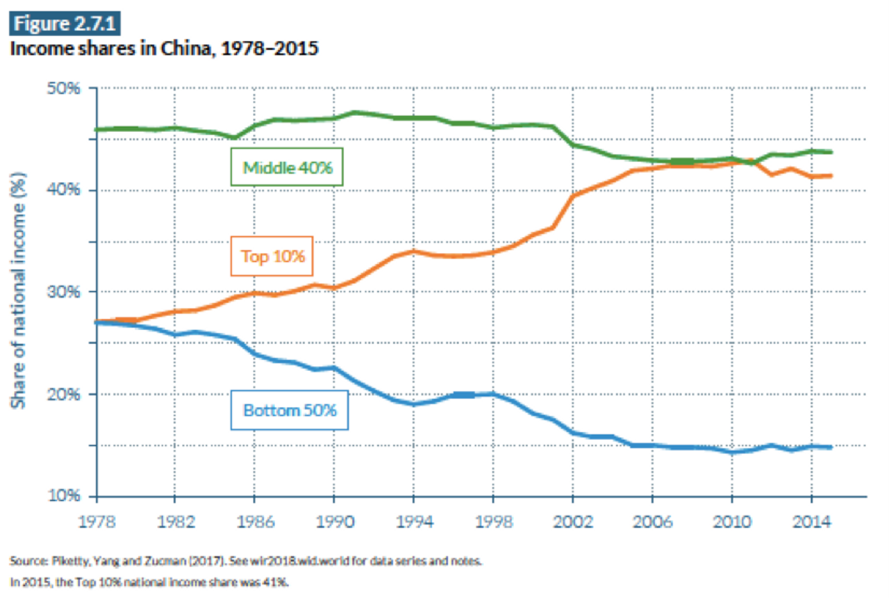 En China, las reformas favorables al mercado implementadas por la burocracia estalinista que comenzaron a fines de la década de 1970 produjeron un crecimiento más prolongado de la desigualdad. Mientras que el 50 por ciento más pobre y el 10 por ciento más rico obtuvieron la misma proporción del ingreso nacional en 1978, el 10 por ciento más alto ahora lleva casi tres veces más que el 50 por ciento más bajo.