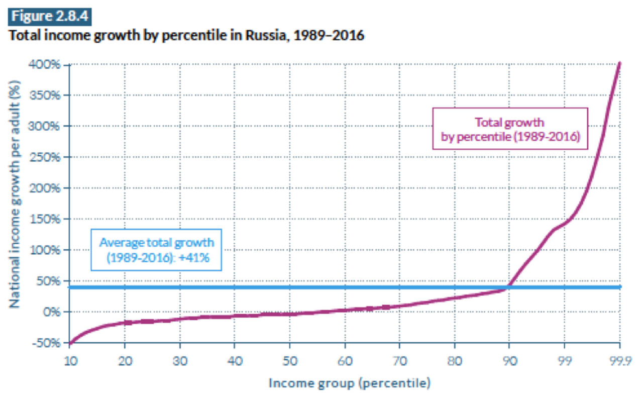 En la propia Rusia, la reintroducción de la propiedad privada "dio como resultado la redistribución masiva y el empobrecimiento de millones de hogares rusos, particularmente entre las poblaciones retiradas. La parte del ingreso nacional acumulado en el 50 por ciento más bajo colapsó, cayendo de alrededor del 30 por ciento del ingreso total en 1990-1991 a menos del 10 por ciento en 1996 ".