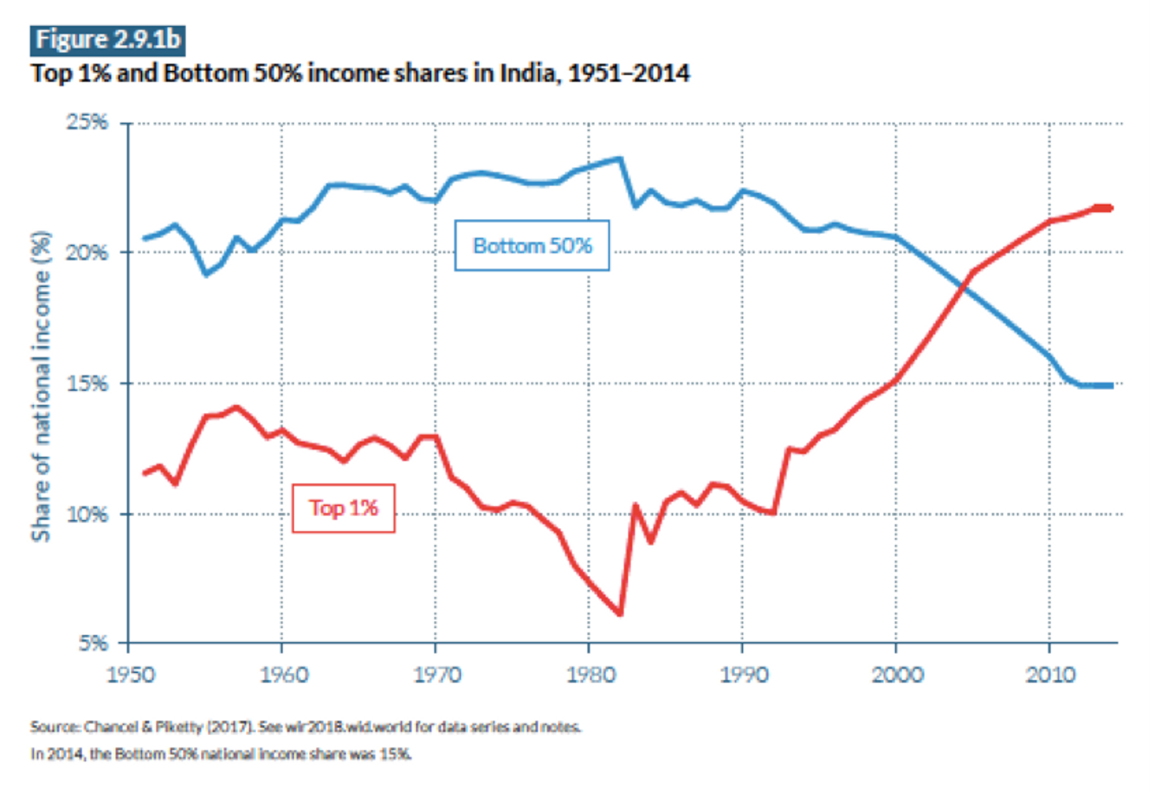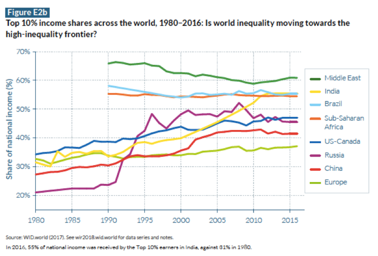 Pero la disolución de la Unión Soviética por parte de las potencias imperialistas y la burocracia estalinista "contribuyó a un fuerte aumento de los porcentajes máximos de ingresos" en todo el mundo. En Rusia, el 1 por ciento superior ahora controla el 20 por ciento de los ingresos, igual a la distribución bajo el zar. En India, el 1 por ciento superior controla el 22 por ciento de los ingresos, peor que bajo el dominio colonial inglés.