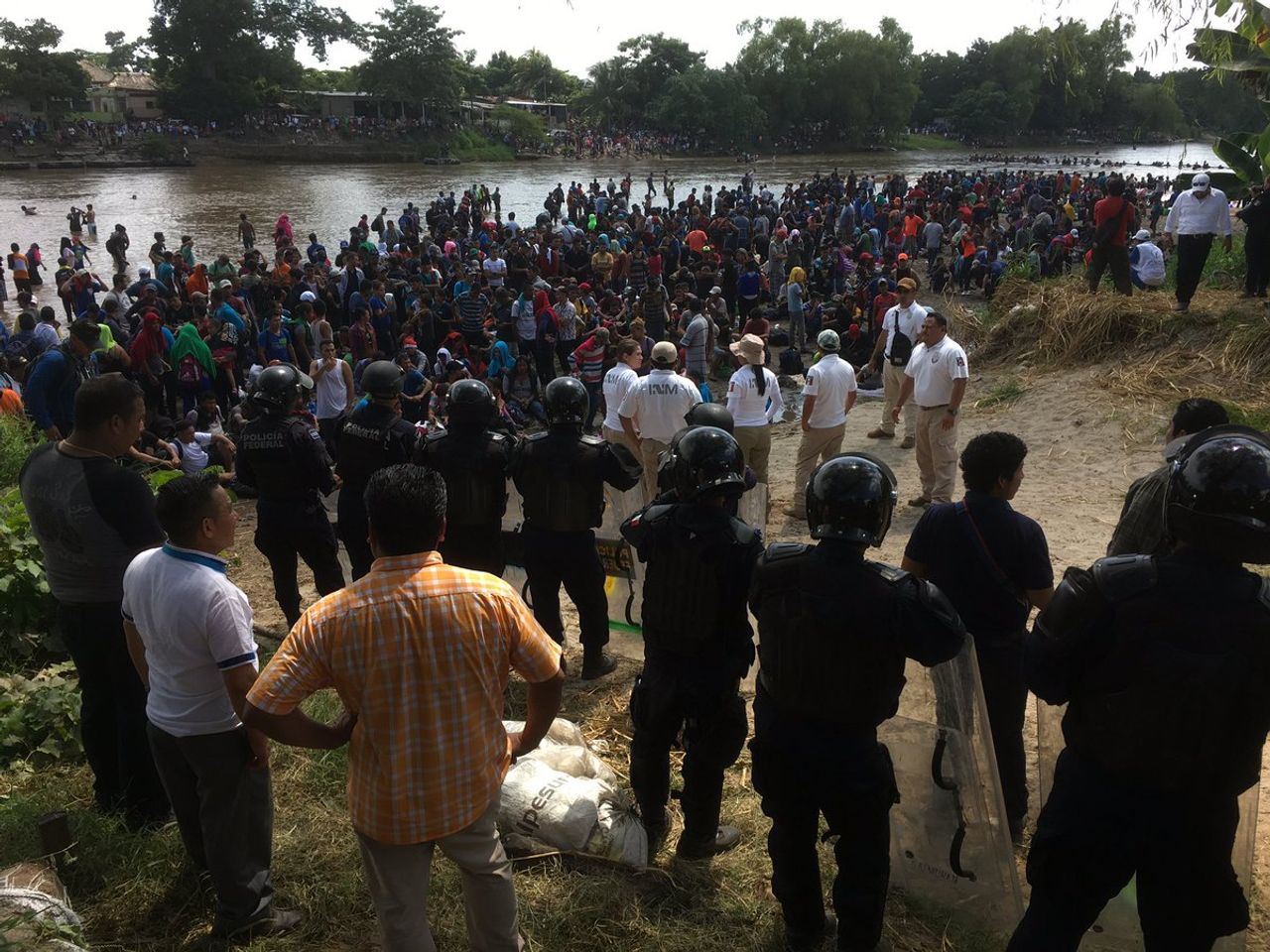 El lunes por la mañana, unos 600 migrantes decidieron arriesgarse a cruzar el río Suchiate bajo el puerto de entrada, mientras que los barcos con tropas de la marina intentaron intimidarlos y un helicóptero de la policía voló a unos pocos pies del río para generar olas, que casi ahoga a familias enteras, fatigadas, deshidratadas y hambrientas, junto con periodistas.