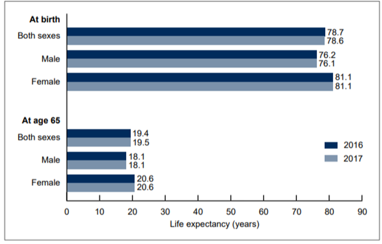 La esperanza de vida promedio en los Estados Unidos disminuyó de 78.7 a 78.6 años. La esperanza de vida disminuyó para los hombres de 76.2 a 76.1, pero se mantuvo igual para las mujeres en 81.1. La esperanza de vida para las mujeres se sido consistentemente más alta que la de los hombres y la brecha continúa ampliándose. En 2017, la diferencia en la esperanza de vida entre mujeres y hombres aumentó de 4.9 años en 2016 a 5.0 años en 2017.