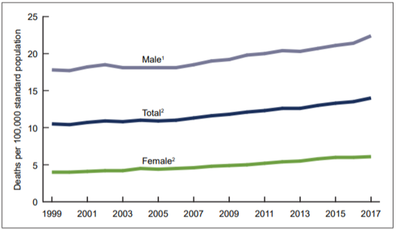 El aumento promedio anual en las tasas de suicidio pasó de aproximadamente el uno por ciento por año desde 1999 hasta 2006 al dos por ciento por año desde 2006 hasta 2017. La tasa de suicidio ajustada por edad entre las mujeres aumentó de 4.0 por 100,000 en 1999 a 6.1 en 2017, mientras que la tasa para hombres aumentó de 17.8 a 22.4.
