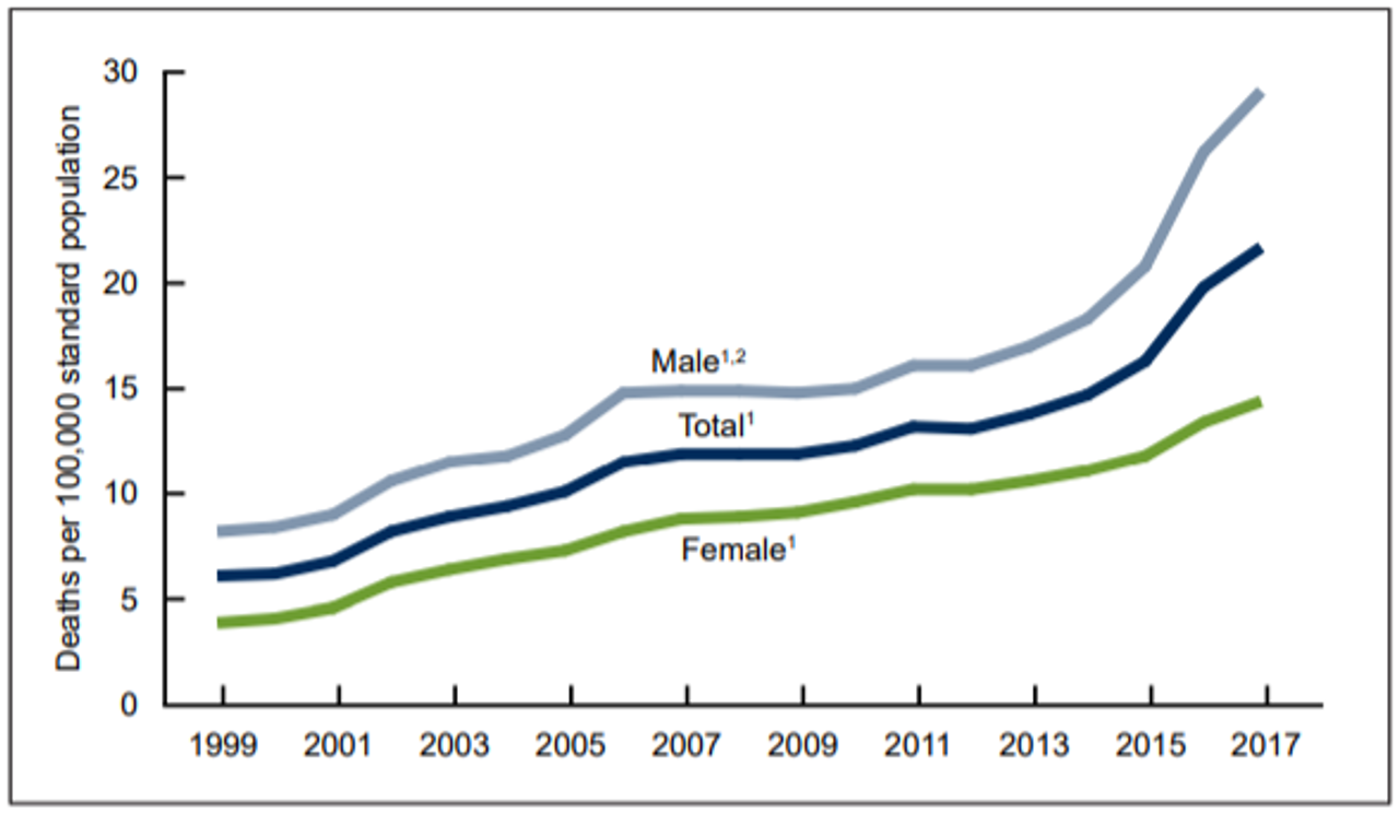 La tasa de sobredosis de drogas se ha disparado en el mismo período. Desde 1999 hasta 2017, la tasa de sobredosis se disparó de 6.1 por 100,000 a 21.7 por 100,000. La tasa aumentó en un promedio del 10 por ciento por año de 1999 a 2006, del 3 por ciento por año de 2006 a 2014, y un asombroso 16 por ciento por año de 2014 a 2017. El aumento coincide con la crisis de opioides que asola partes enteras de los Estados Unidos, concentrándose en los estados de West Virginia, Ohio y Pennsylvania.