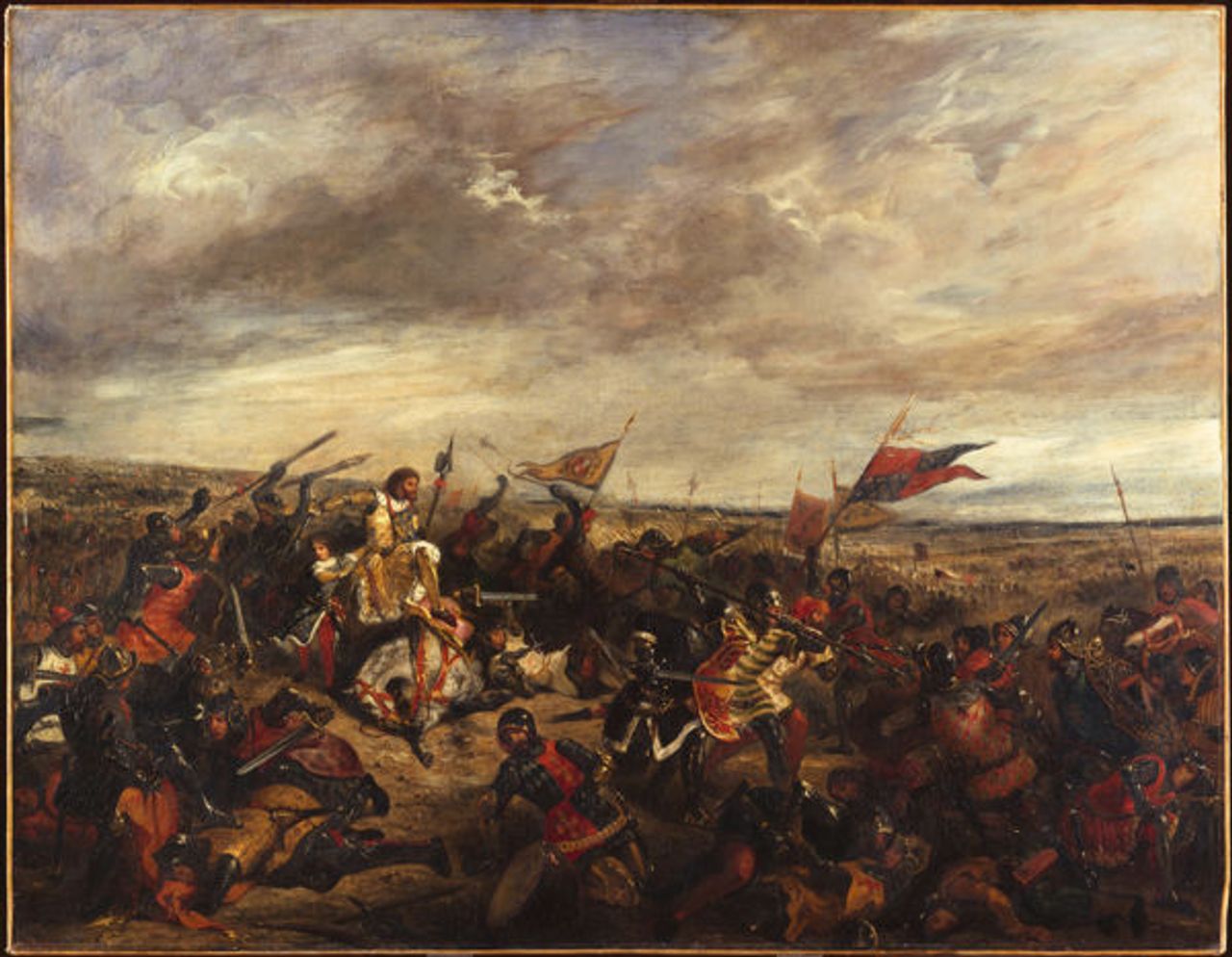 Gran parte del trabajo de Delacroix fue a gran escala encargado de edificios públicos e iglesias, y como tal no se pudo mover. Pero la exposición incluye La batalla de Nancy y L a muerte de Carlos el Audaz, Duque de Borgoña, 5 de enero de 1477 (1831) y La batalla de Poitiers (1830), ambas celebran la monarquía borbónica. Por mucho que el pintor intentara alejar su arte de la lucha política inmediata al elegir sujetos del pasado lejano, inevitablemente tuvo que navegar por las cambiantes fortunas políticas de sus mecenas. En el caso de esta última pintura, había sido encargada por la duquesa de Berry, nuera del último monarca borbónico, Carlos X. Delacroix tuvo que recuperar la obra, sin pagar, después de que Louis Philippe derrocara a los Borbones en el la Revolución de julio de 1830 y la duquesa huyo.
