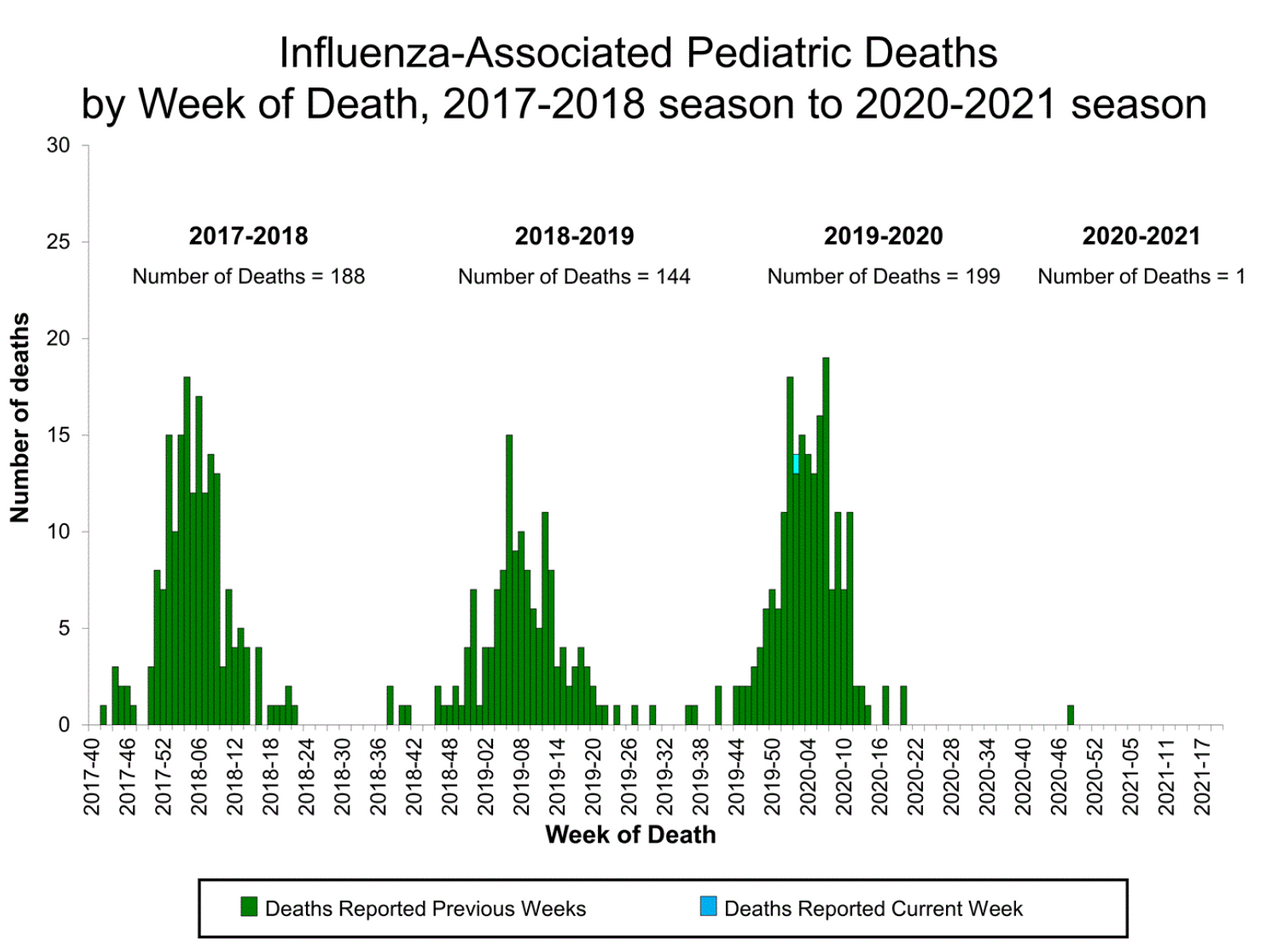 En Estados Unidos, según los Centros para el Control y la Prevención de Enfermedades (CDC), desde el 27 de septiembre de 2020, de más de un millón de pruebas de gripe, solo hubo 1.899 (0,2%) resultados positivos (713 de gripe A y 1.186 de gripe B) durante la temporada de gripe 2020-2021. De las 600 muertes registradas por la gripe, sólo hubo una muerte pediátrica asociada a la gripe.