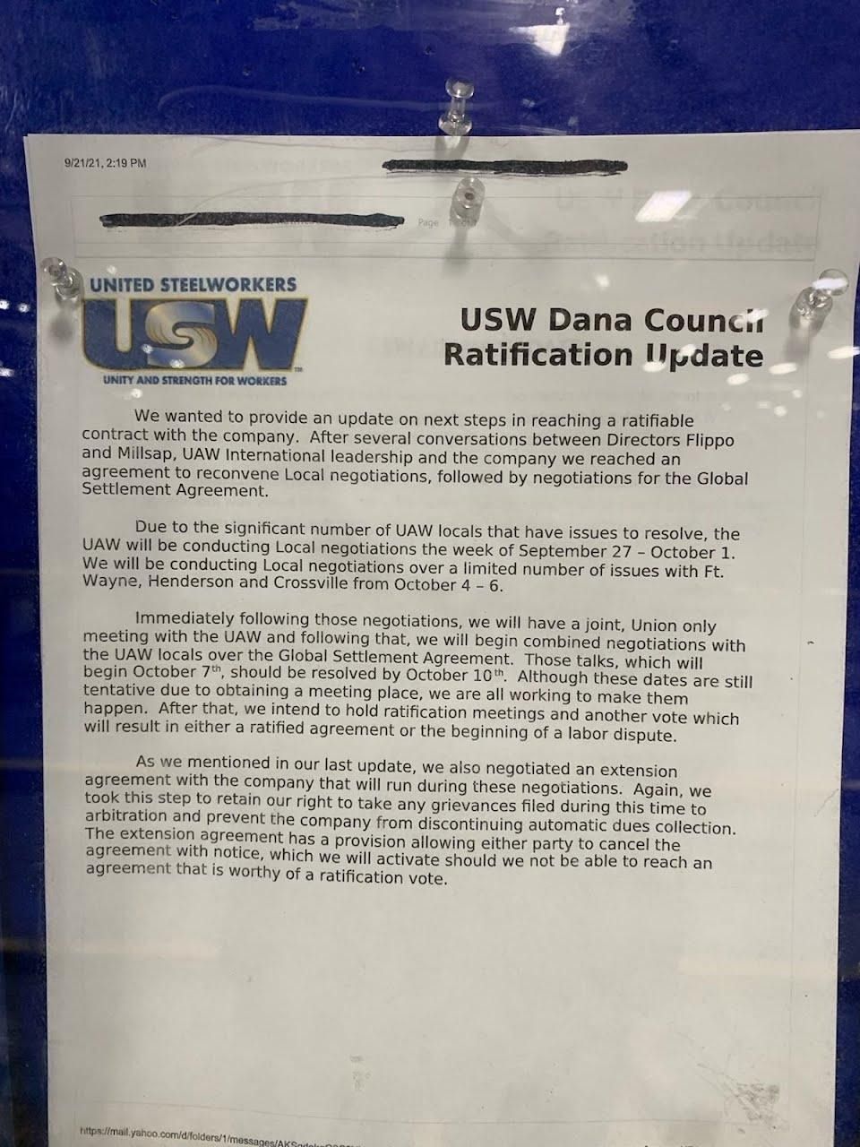 El martes, el sindicato United Steelworkers (USW) publicó un anuncio que afirmaba ser “una actualización de los siguientes pasos para alcanzar un contrato que pueda ser ratificado con la empresa”. Según el documento sin firma, el USW y el United Auto Workers (UAW) afirman que no ser reunirán con la empresa para discutir el acuerdo global hasta el 7 de octubre.