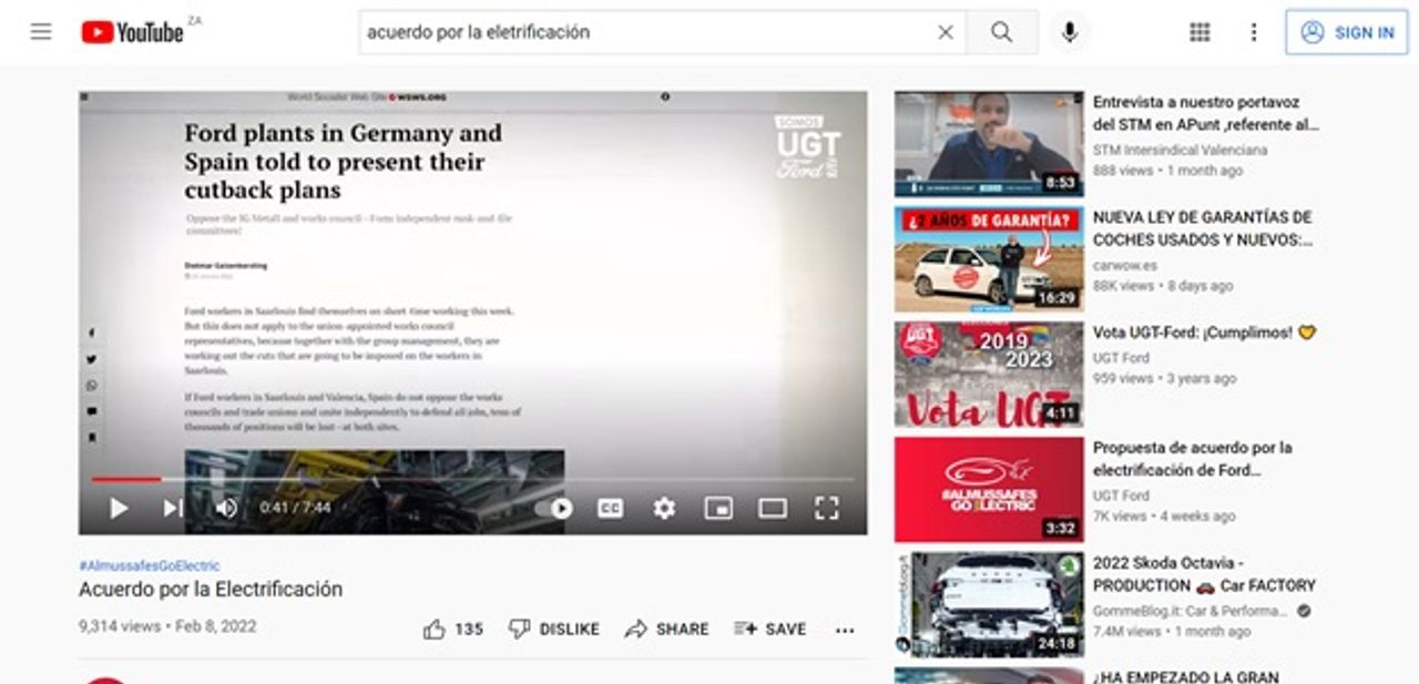 En su vídeo, sin embargo, la UGT afirma: “Durante esta última temporada habrás escuchado muchas noticias sobre la situación y futuro de nuestra fábrica, opiniones sobre nuestra capacidad para negociar buenos acuerdos, también críticas, incluso algunas al margen de la realidad.” Mientras se lee esta frase, el video muestra un artículo del WSWS sobre Ford publicado el 24 de enero.
