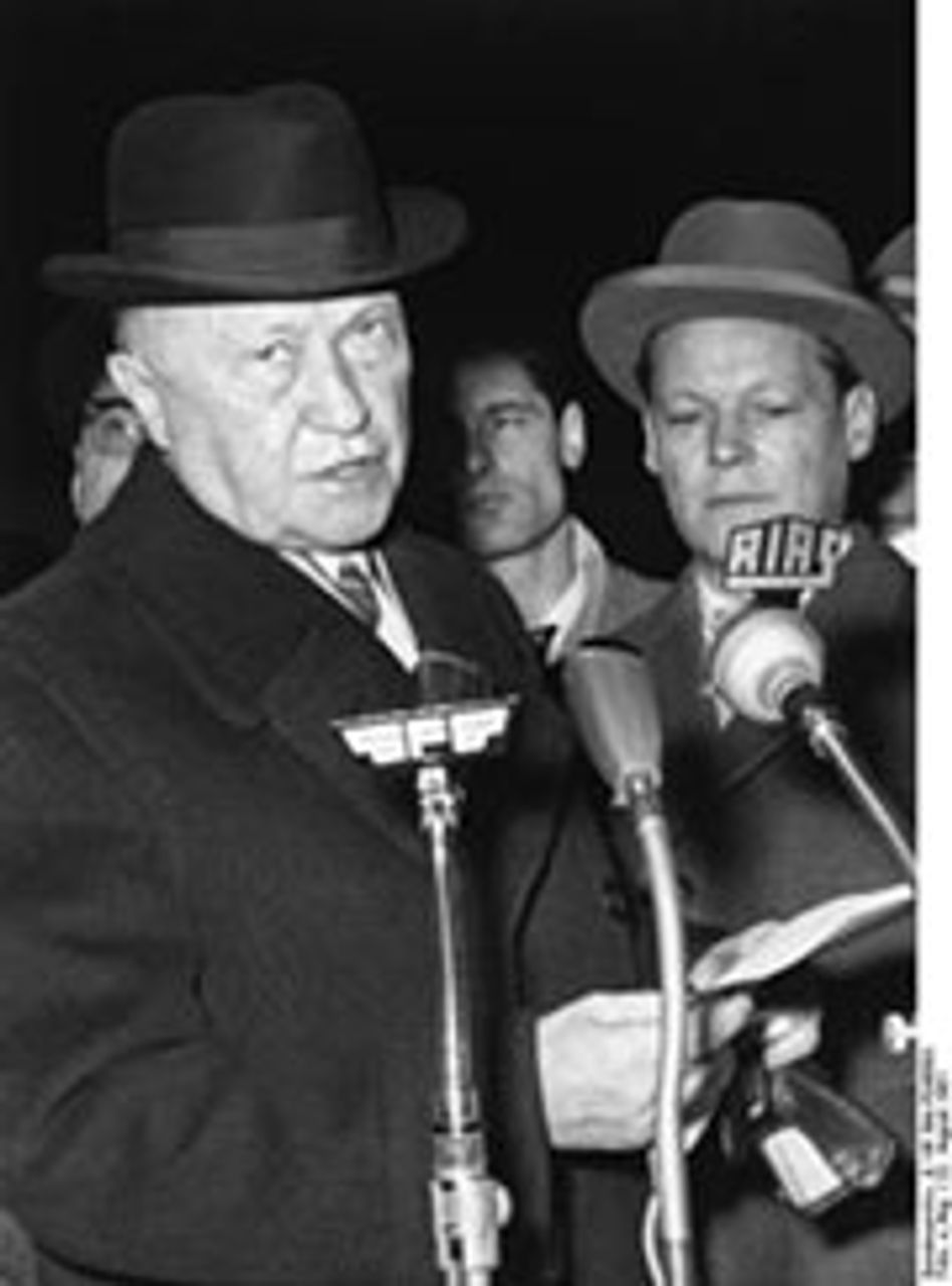 Le chancelier Adenauer et Willy Brandt lors de la construction du mur de Berlin. (Bundesarchiv, B 145 Bild-P046883 / CC-BY-SA)Le 17 juin 1953, durant le soulèvement des travailleurs Est-allemands, il prit des mesures afin d’empêcher que la révolte ne se propage à l’Allemagne de l’Ouest. Lorsqu’une délégation d’ouvriers du bâtiment en grève travaillant dans la Stalinallee et les ouvriers des aciéries de Hennigsdorf marchèrent sur Berlin-ouest et s’emparèrent de la radio RIAS dans une tentative de propager un appel à la grève générale commune en Allemagne de l’Est et de l’Ouest, Brandt contribua à l’empêcher.