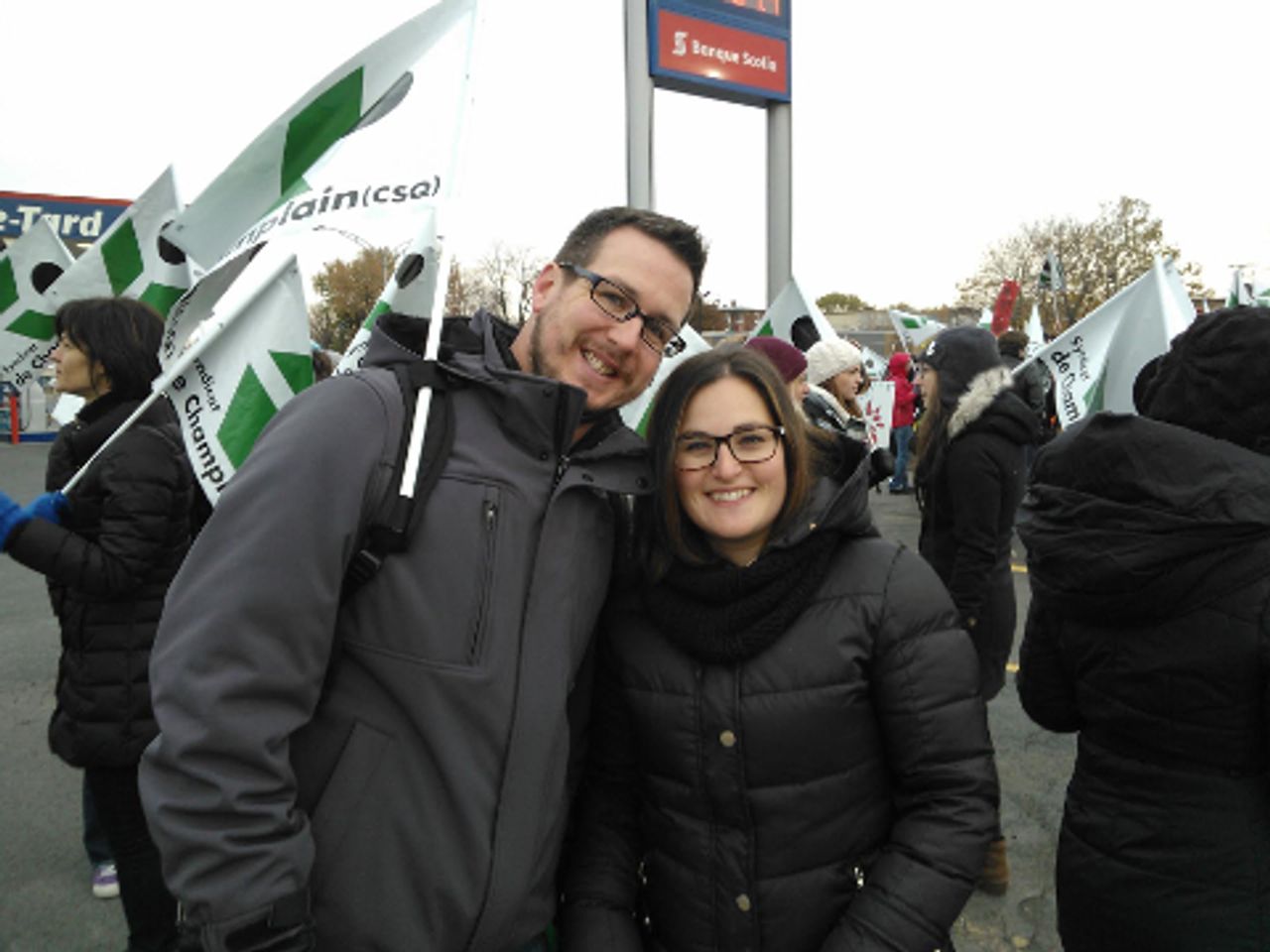 Mathieu et PascaleMathieu et Pascale, deux enseignants du primaire ont aussi exprimé leur mécontentement. «Ça n’a pas de bon sang que les offres salariales ne couvrent pas même le coût de la vie. En plus le gouvernement veut augmenter les ratios, retirer l’aide aux enfants plus en difficulté», a dit Mathieu. Pascale a affirmé que «c’est faux de dire que les services ne sont pas affectés. Pour ma part, je n’ai même plus l’aide d’un éducateur spécialisé alors que j’enseigne en adaptation scolaire».