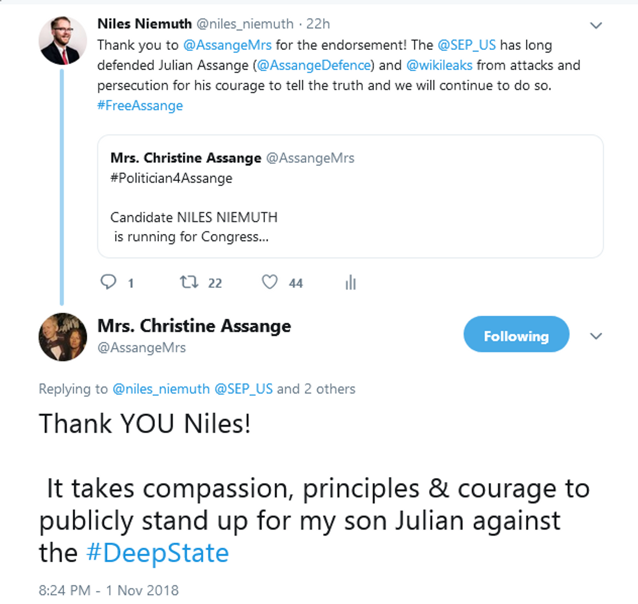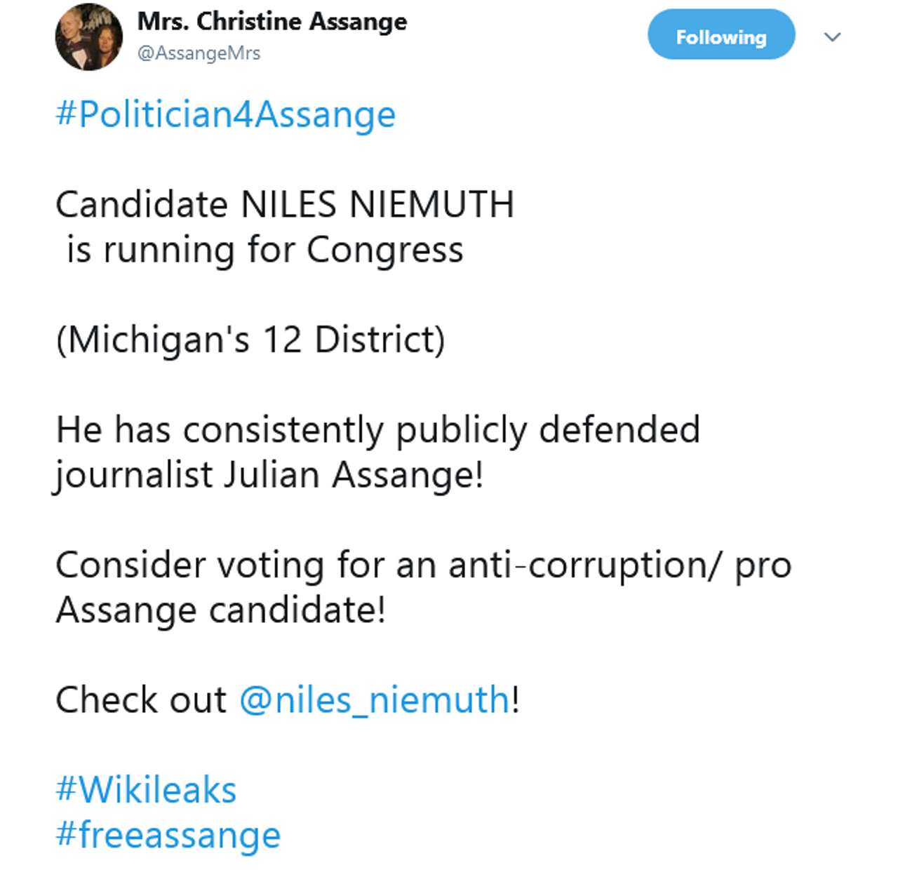 « Le candidat NILES NIEMUTH est en lice pour le Congrès (au district 12 du Michigan). Il a toujours défendu publiquement le journaliste Julian Assange ! Envisagez de voter pour un candidat anticorruption/pro Assange ! Découvrez @niles_niemuth ! », a écrit Christine Assange.
