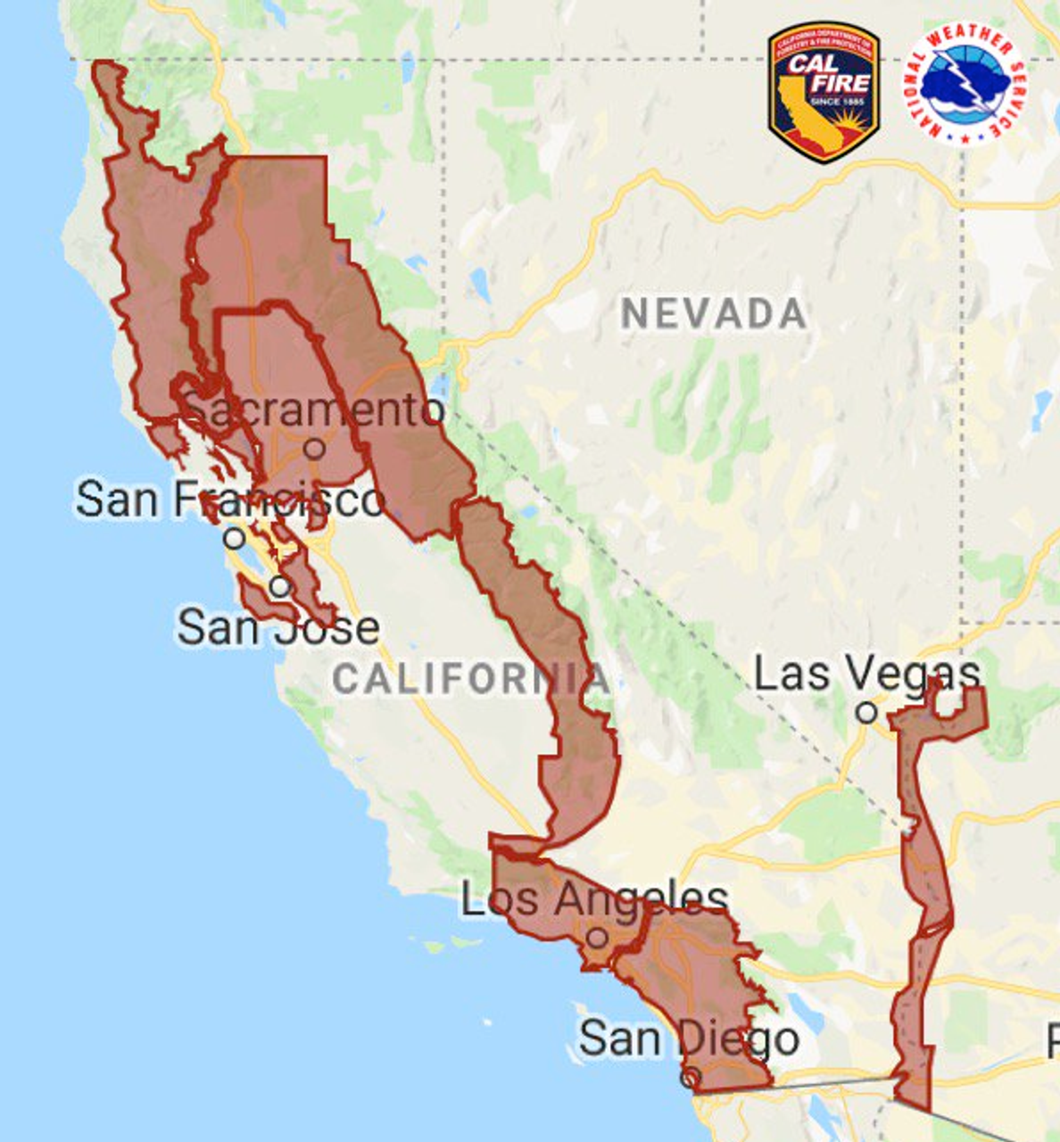Deux jours avant que les récents incendies n'éclatent, le département californien des forêts et de la prévention des incendies (Cal Fire Prevention) a émis des avertissements selon lesquels 23 millions de personnes dans l'État se trouvaient dans des zones où les conditions étaient propices à la prolifération rapide d'incendies. On s'attendait à des vents de 30 à 45 km/h avec des rafales pouvant atteindre 80 km/h.