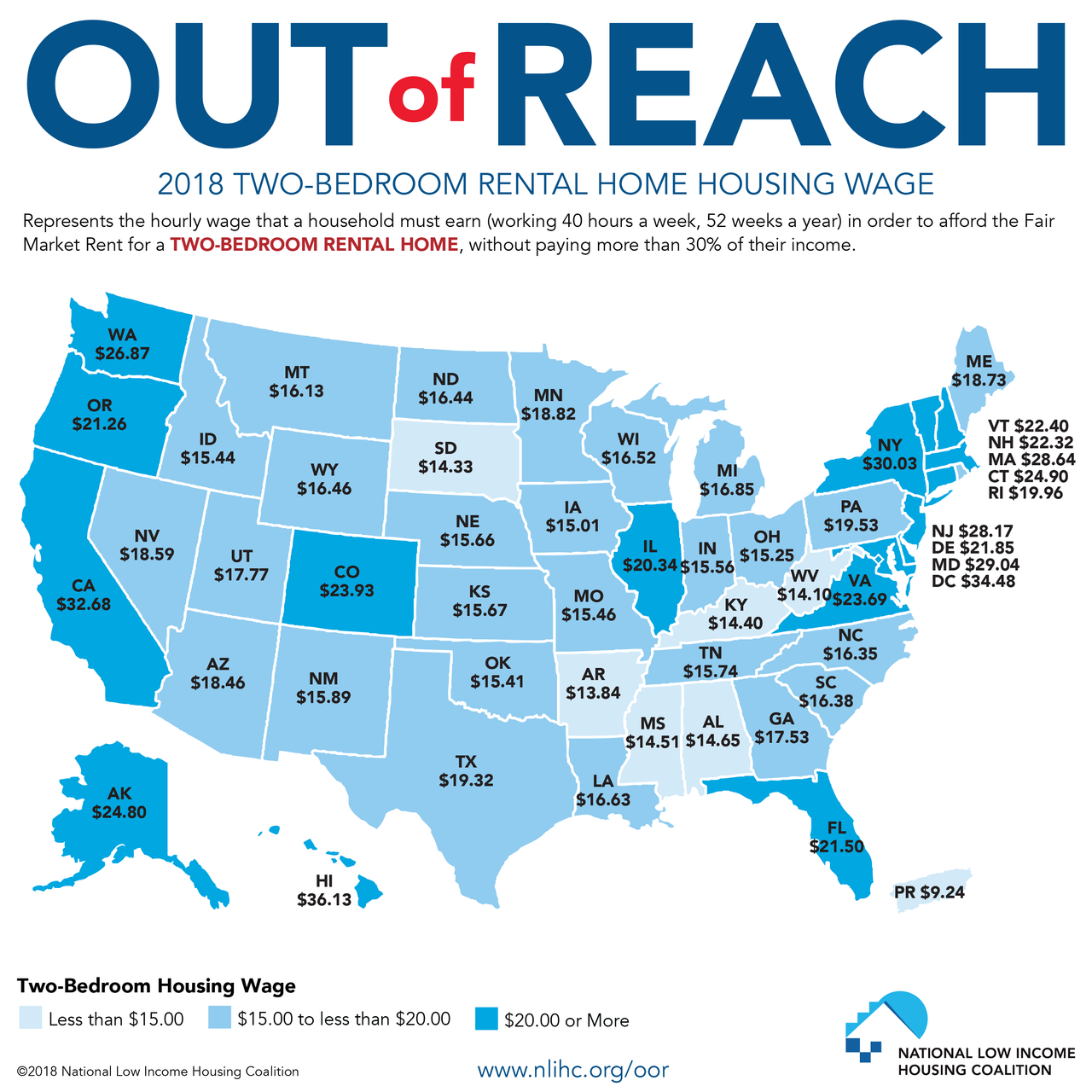 Plus tôt cette année, un rapport de la Coalition nationale du logement pour les personnes à faible revenu révélait qu’il n’existait pas un seul endroit aux États-Unis où une personne travaillant à temps plein au salaire minimum pouvait se permettre de louer un modeste appartement de deux pièces. Une personne travaillant 40 heures par semaine, 52 semaines par an, aurait besoin d’un salaire horaire de 26,87 dollars (23,57 euros) pour se permettre un tel appartement sans dépenser plus de 30 pour cent de son revenu. Dans la capitale, Washington DC, où le salaire minimum actuel est de 13,25 dollars (11,62 euros), il faudrait gagner 34,48 dollars (30,25 euros) de l’heure pour louer un modeste deux-pièces.